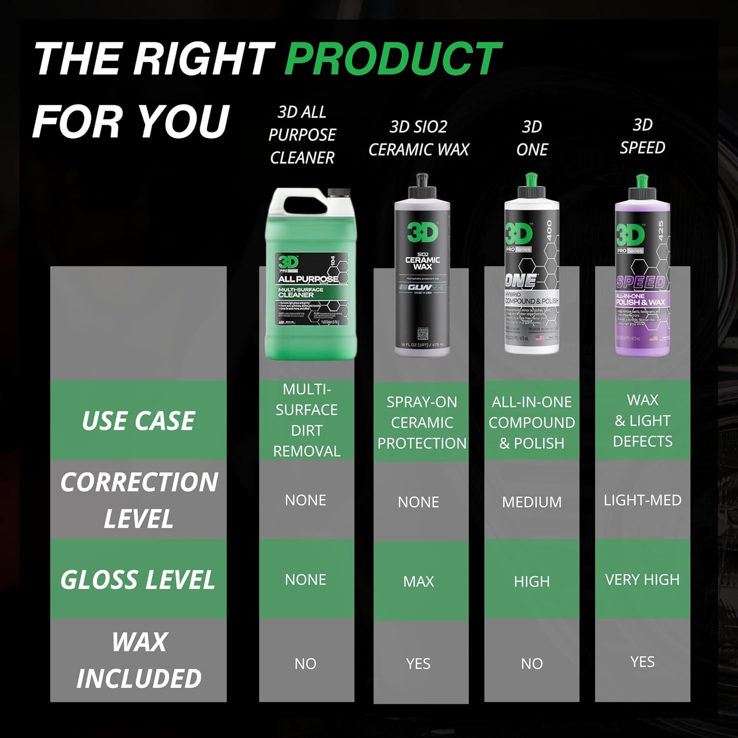 - Engine Bay to Cupholders—Cleans It All: From your engine bay to trunk liners, door jams to dashboards, this one bottle does it all. Whether you're prepping for a show or just tired of sticky cupholders, 3D All Purpose Cleaner helps you detail like a pro without overloading your garage