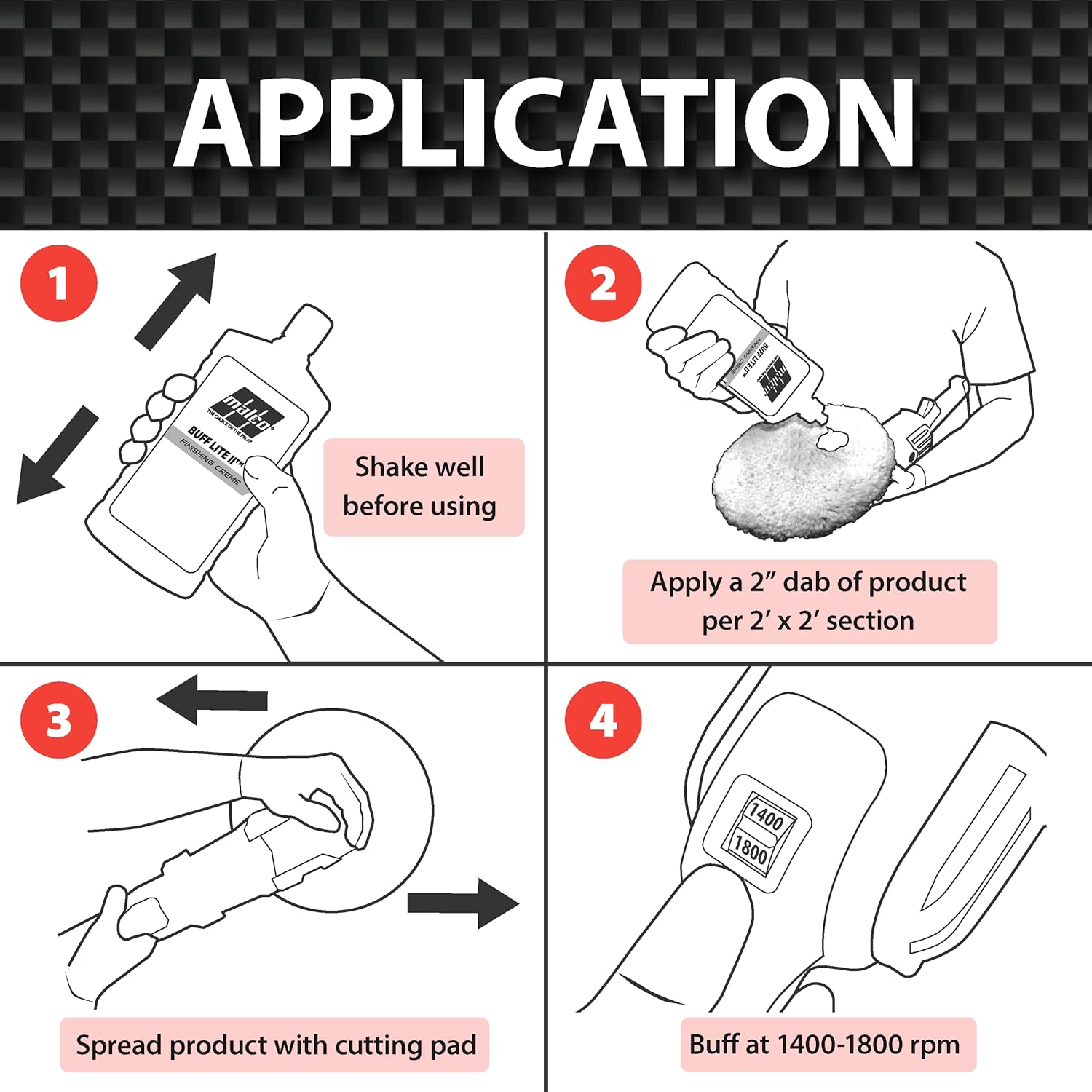 - BEST USE: Apply a 2” dab of Buff Lite II for a 2’ x 2’ section and spread with the cutting pad. Buff at a speed between 1400 - 1800 rpm. After compounding, wipe surface with a microfiber cloth and then apply a Malco glaze or wax to finish and protect.