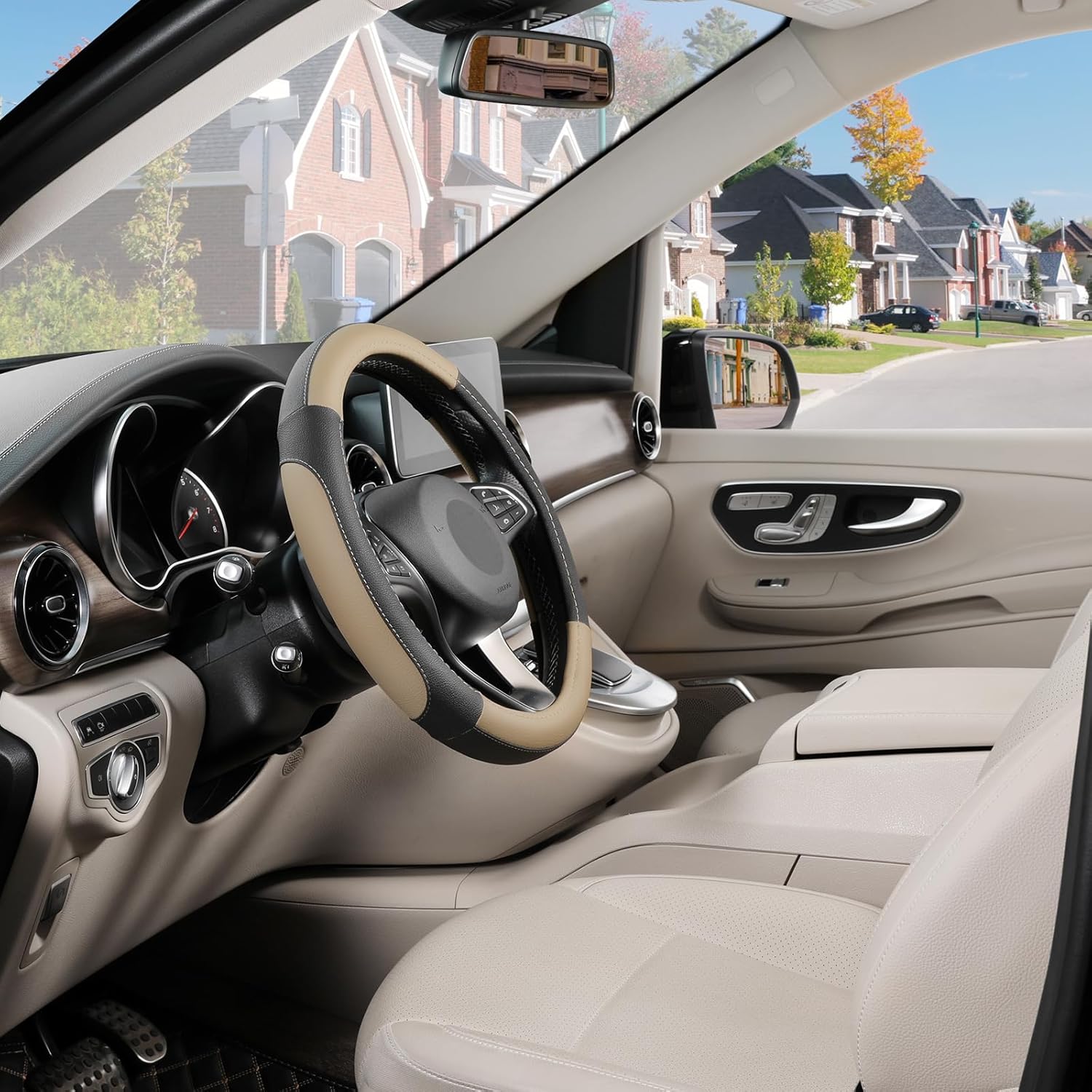 SEG Direct Car Steering Wheel Cover Universal Standard Size 14.5-15 inch, Black and Beige Microfiber Leather