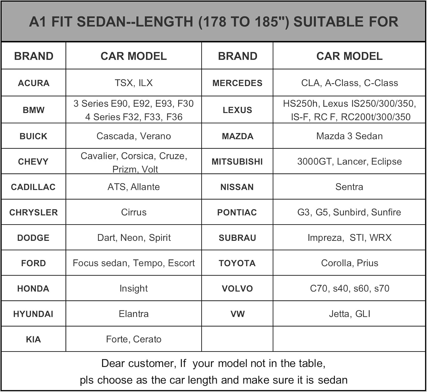 - 【Dimension A1】Universal fit for sedan which length is 178 to185 inch (NOT FOR HATCHBACK AND SUV ). Suitable for Toyota Corolla/ Prius, BMW 3/4 Series, Ford focus sedan,Hyundai elantra, Kia forte/cerato, Lexus is250/300/350, Mitsubishi lancer/Eclipse/3000, Nissan Sentra, Subaru impreza/wrx, vw Jetta etc.