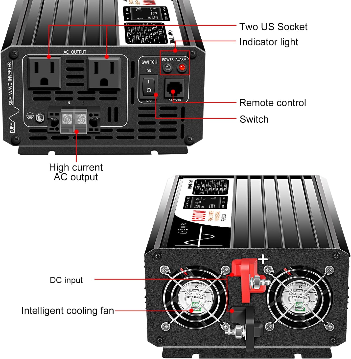 - 【LCD display and remote controlI】nverter with remote control: The cable is 5 meter long, and the long cable will help you easily control the on/off of the inverter. The LCD display is easy to observe the input voltage, output power and protection mode.