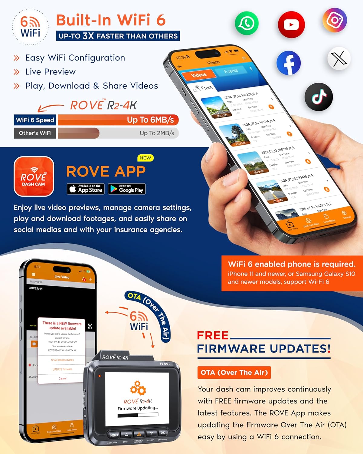 - BUILT-IN WiFi 6 — Use the ROVE App to view and manage dash cam recordings instantly on your iPhone (iOS) or Android smartphone. Download your recorded 4K videos directly to your smartphone at a speed of up to 6MB/s, and easily share them on social media with friends and family.