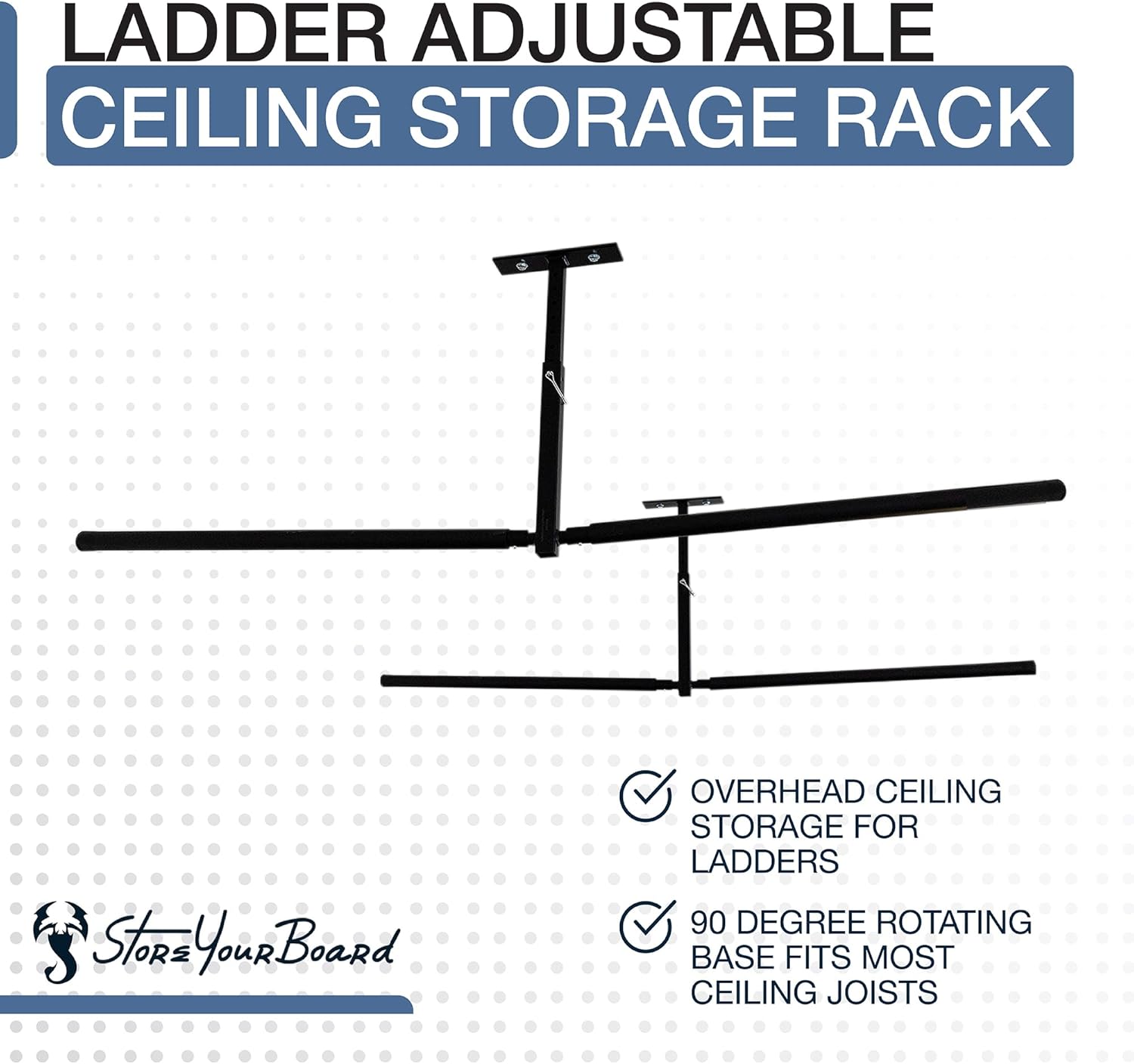 - Adjustable Height Ceiling Mount – Ladder ceiling rack features an extendable post from 12.125" to 20.125" for flexible storage. Locking gated pin system ensures a safe, secure fit for multiple ladder sizes.