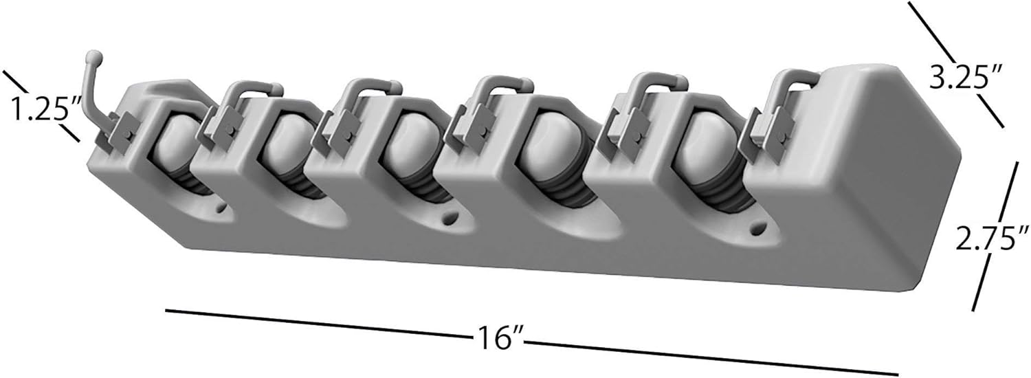 - PRODUCT DETAILS - Materials: High-Density Plastic and Rubber. Dimensions: (L) 16" x (W) 2.75" x (H) 3.25". Installation Hardware is Included with the Garage Organization Rack. Color: Gray.