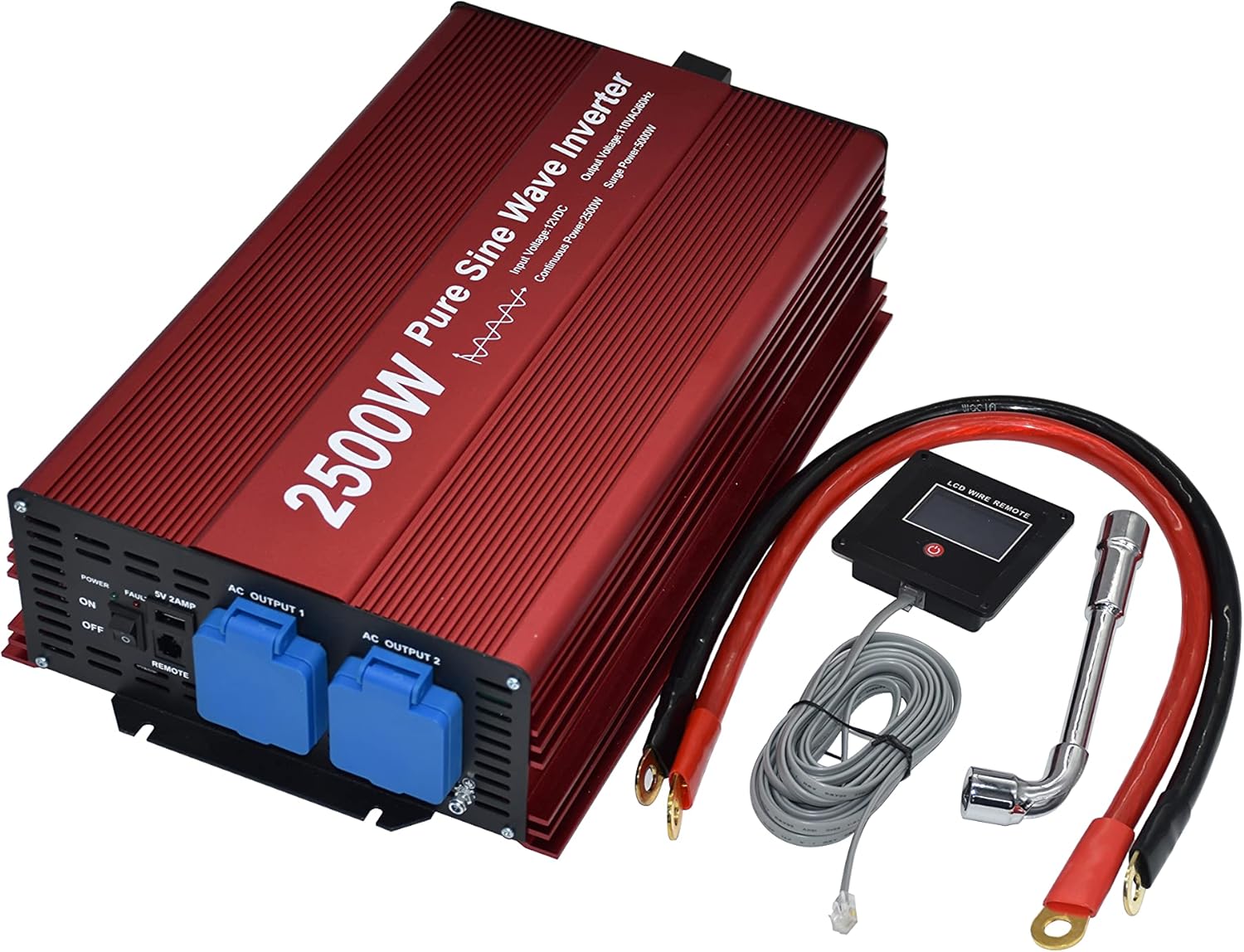 2500W Pure Sine Wave Inverter 12V to 120V AC with 2 AC outlets, DC5V 2 Amp USB Output, LCD Display Wire Remote kit and Heavy Duty Battery Cables.
