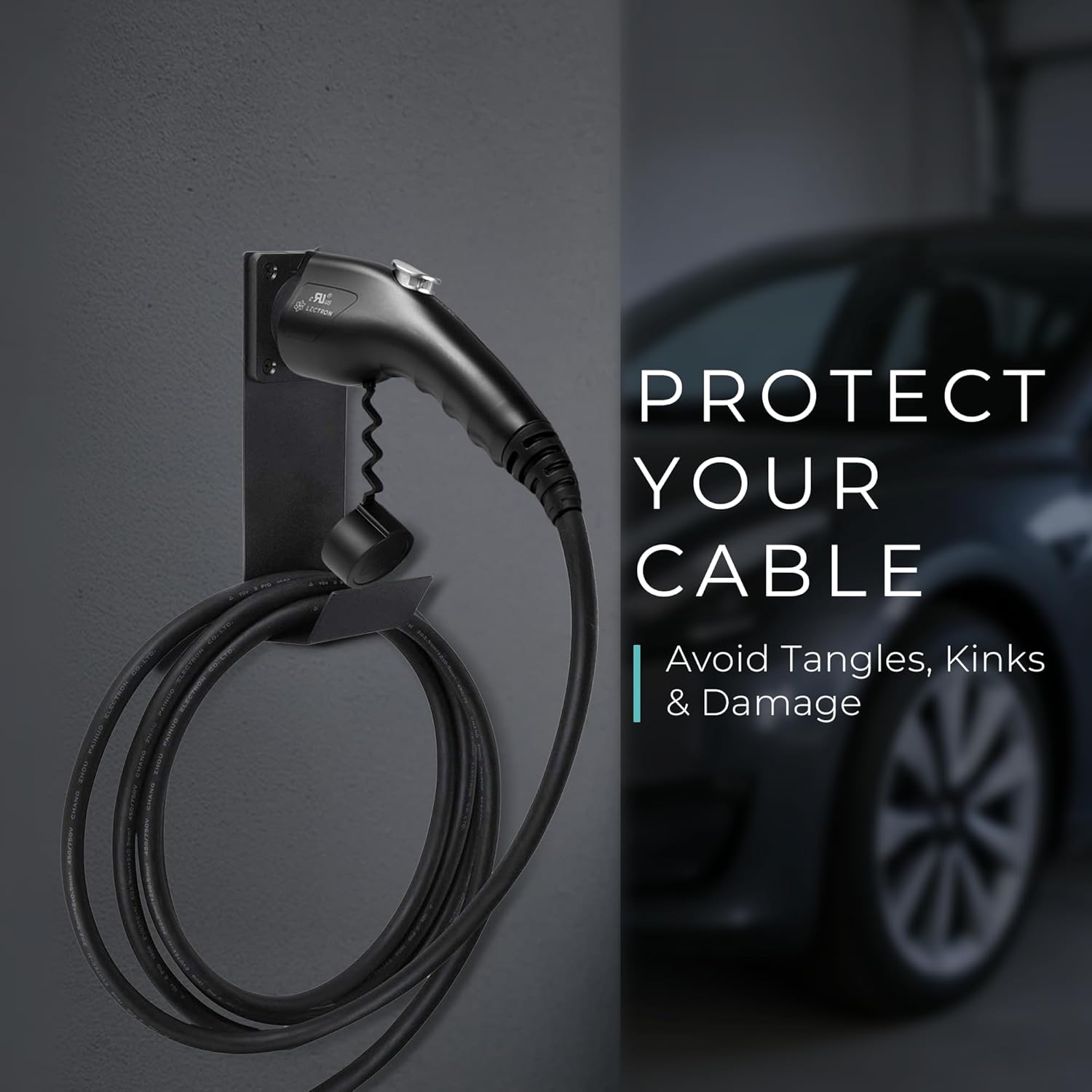 - SIMPLE TO USE – Compatible with all J1772 connectors. Insert your EV home charger into the dock until it clicks into place. The holster will latch onto the nozzle securely to keep it from falling out, so never again will you have to balance the charger precariously on a shelf. In addition, the hook will securely hold the cable off the ground to prevent the it from kinking and getting tangled, thus helping to extend the life of your EV Charger