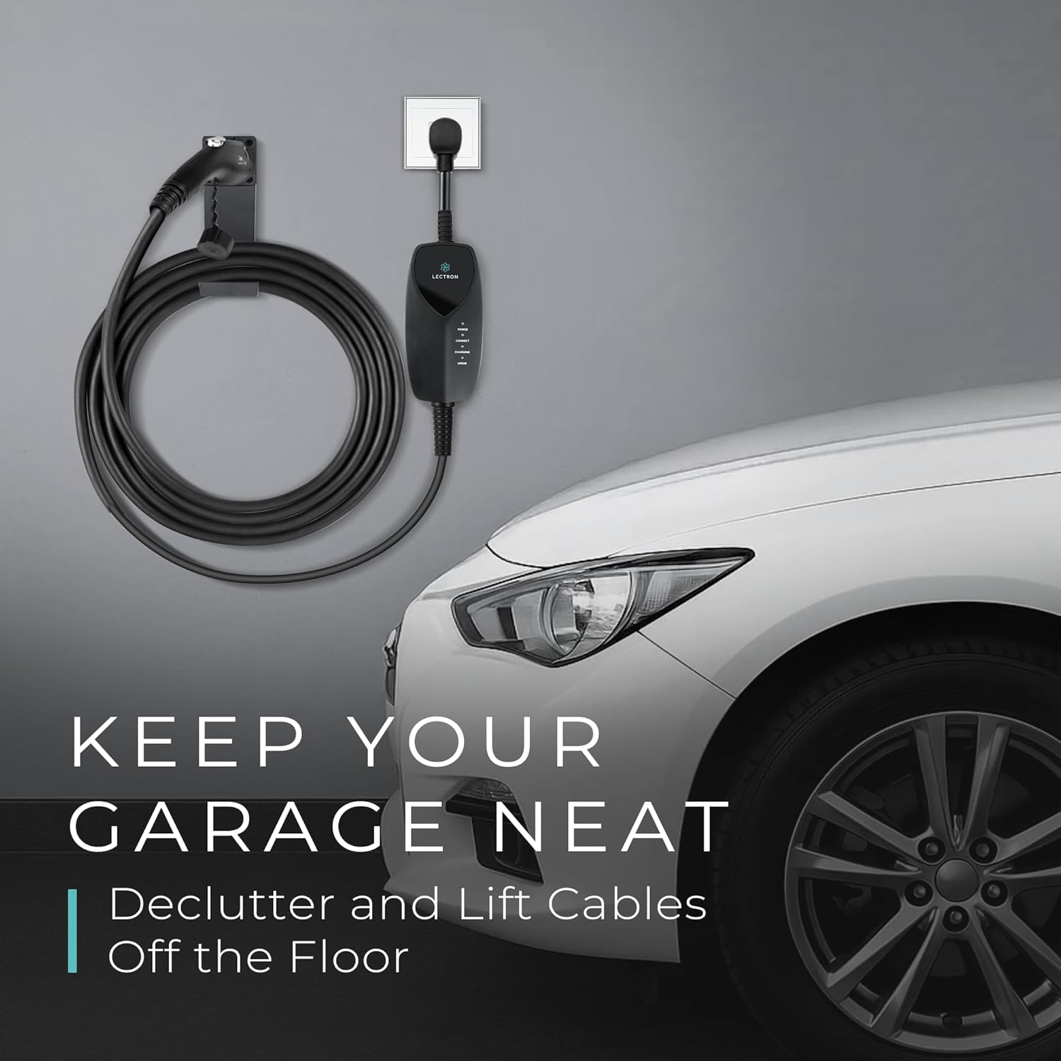 - IMPROVE ORGANIZATION – This dock and hook combination is truly the perfect accessory for your EV charger. It is a simple addition that will have a huge impact to the outlook of your garage. Designed with the intention of keeping your space organized and to protect your charger from damage