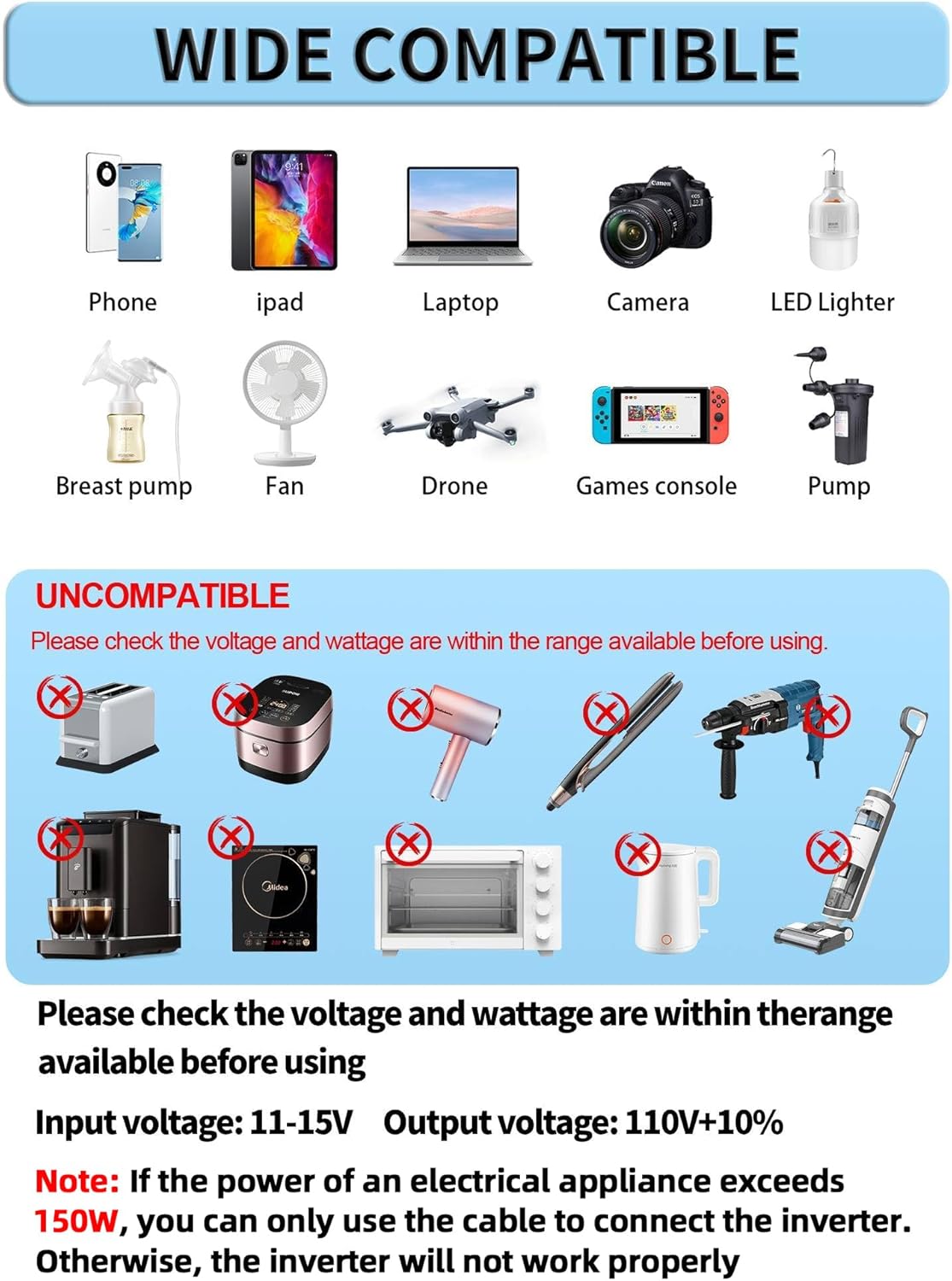 - [2 WAYS OF CONNECTION] - The 24-inch Cigarette Lighter Plug and the Battery Clips are coming with the box, connect it to the vehicle’s Cigarette Lighter or the 12V car battery. (💡Note: the 1000 watt inverter will only provides you a maximum output power of 150W when connecting to the cigarette lighter, to get more power, please connect to the 12V battery)