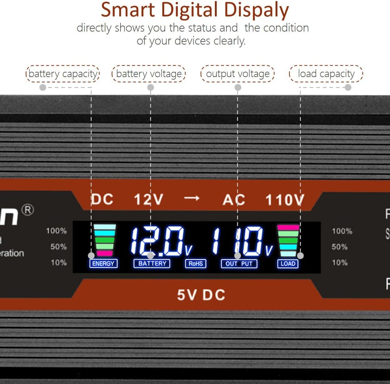 - [INTELLIGENT LCD DISPLAY] - The 1000w power converter real-time display the battery voltage, battery capacity, output voltage and load capacity, better monitoring the working status and the condition of your devices clearly.