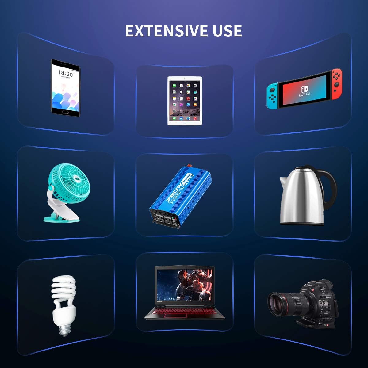 - [Versatile Use Inverter] The 750w invertor can be connected directly to a vehicle lighter or 12V battery for use in emergency inverters, snowstorms and power outages, hurricanes, storms, cell phones, laptops, digital cameras, lights, power tools, and other electronics.