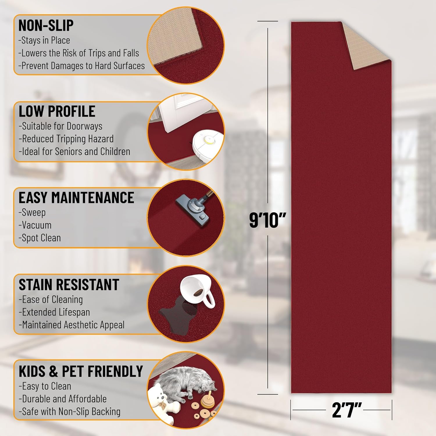 - [Slim 0.2-Inch Profile Clears Doors]: Low-pile construction allows for smooth door clearance and easy furniture placement—perfect for hallways, kitchens, and transitional spaces.