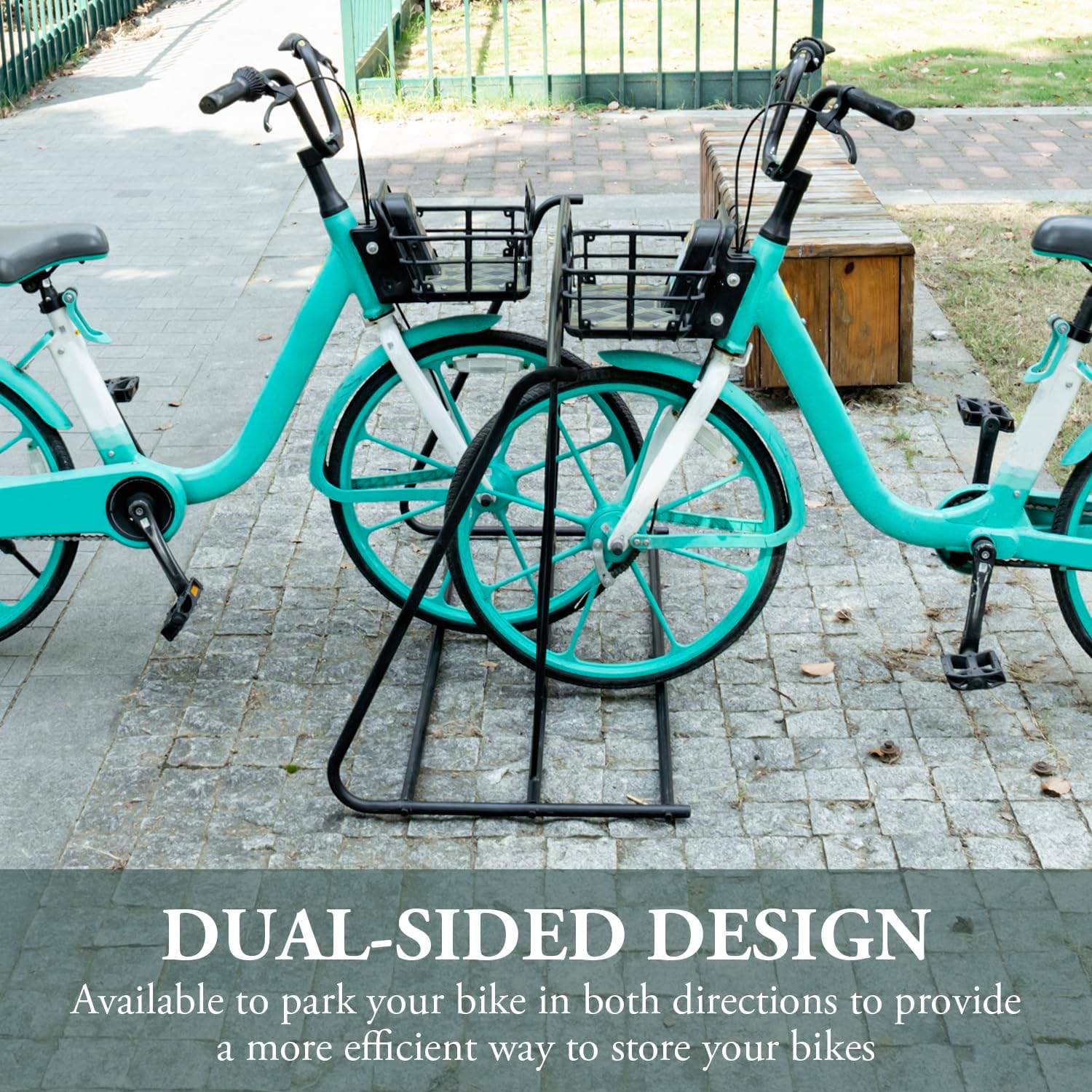 - 6-bicycle floor standing black metal holder provides dual-sided indoor or outdoor parking for bikes **Some assembly required**
