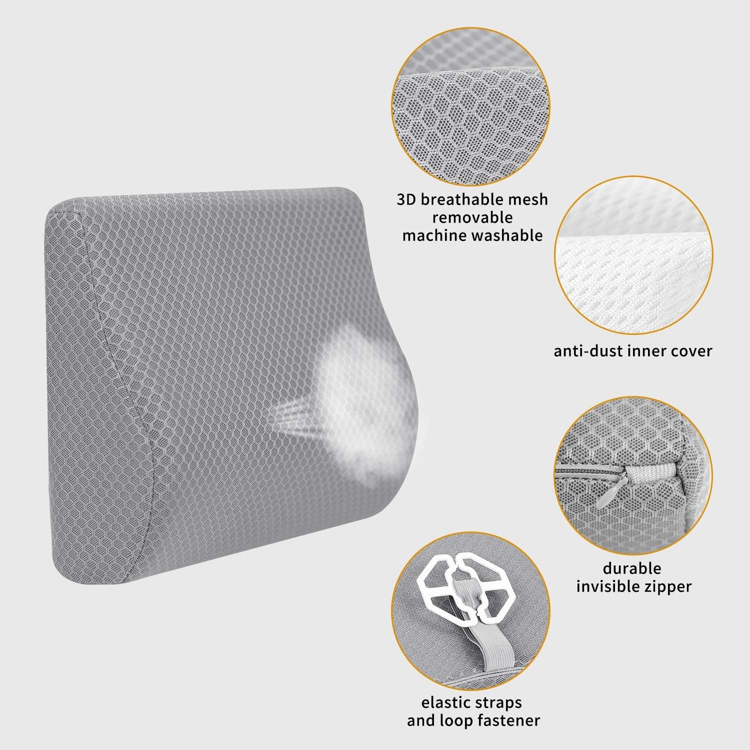- FEATURES: Two elastic straps and buckles that pass the buckle through the gap between the seat and the back, easily fix the lumbar pillow on the car seat to prevent the rear support pad from slipping off. 3D breathable mesh cover can keep air flowing, to keep you cool and comfortable all day. Durable invisible zipper design for easy removal and cleaning. Easily adjust the optimal support position.