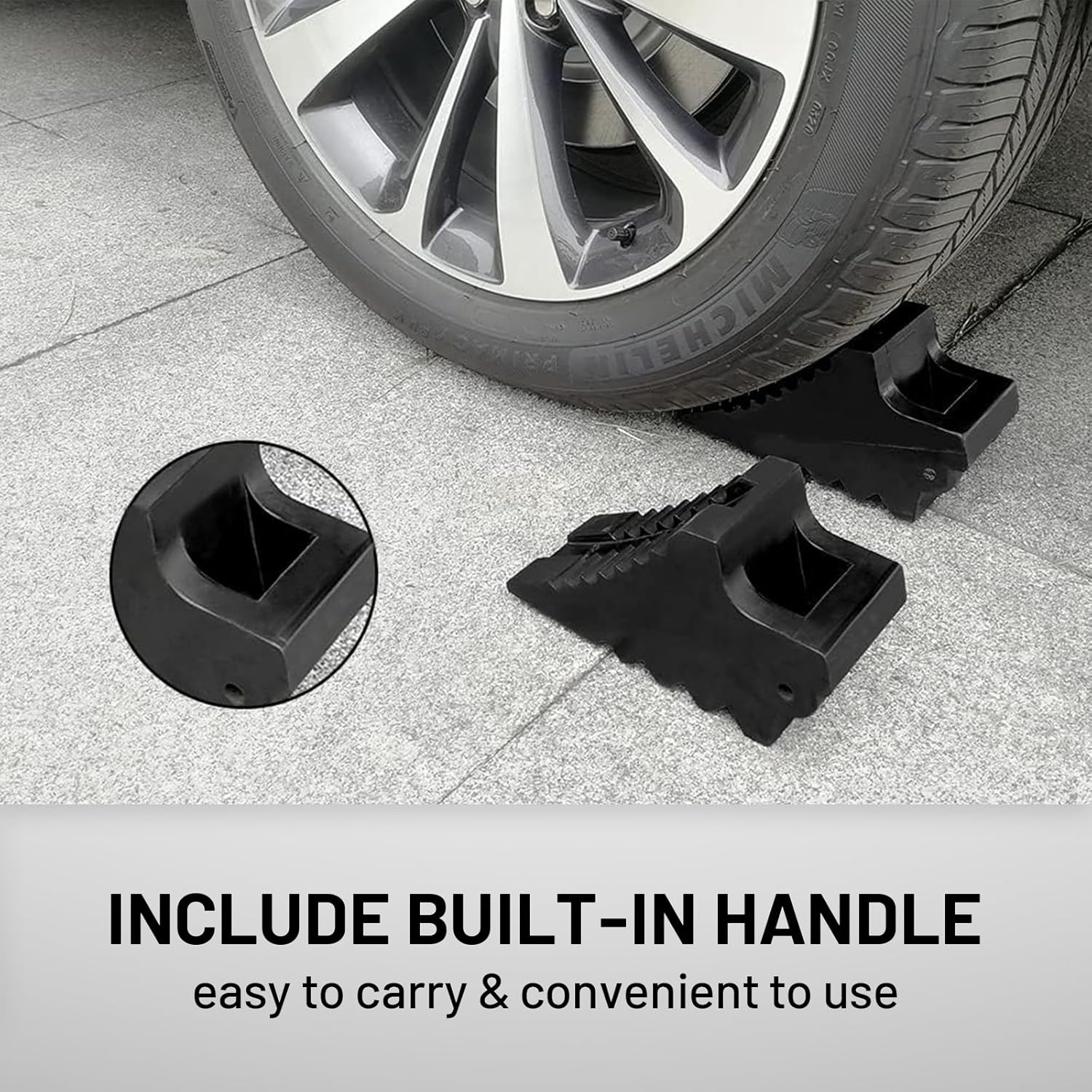 - Handles Design: Perfect built-in rubber handle for convenient carry and storage. These wheel chocks work best for vehicles, ATVs, trailers and RVs that weigh up to G.V.W. 4T.