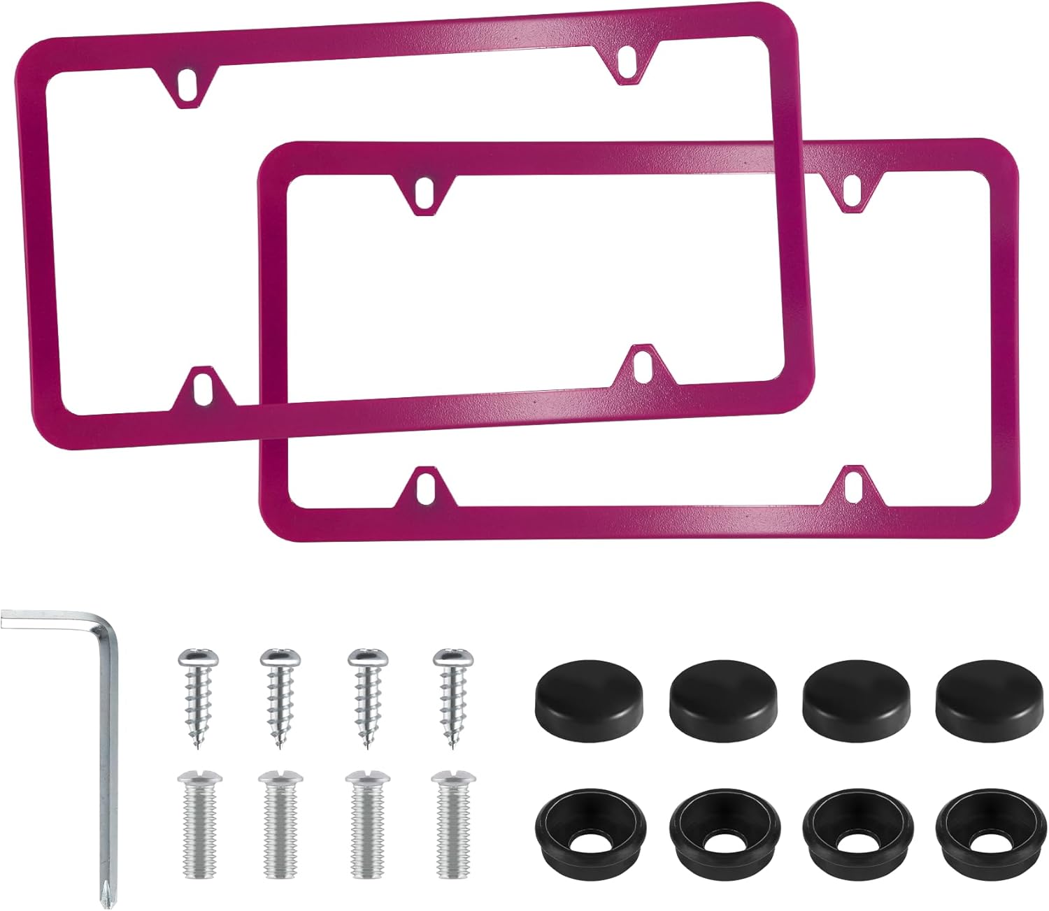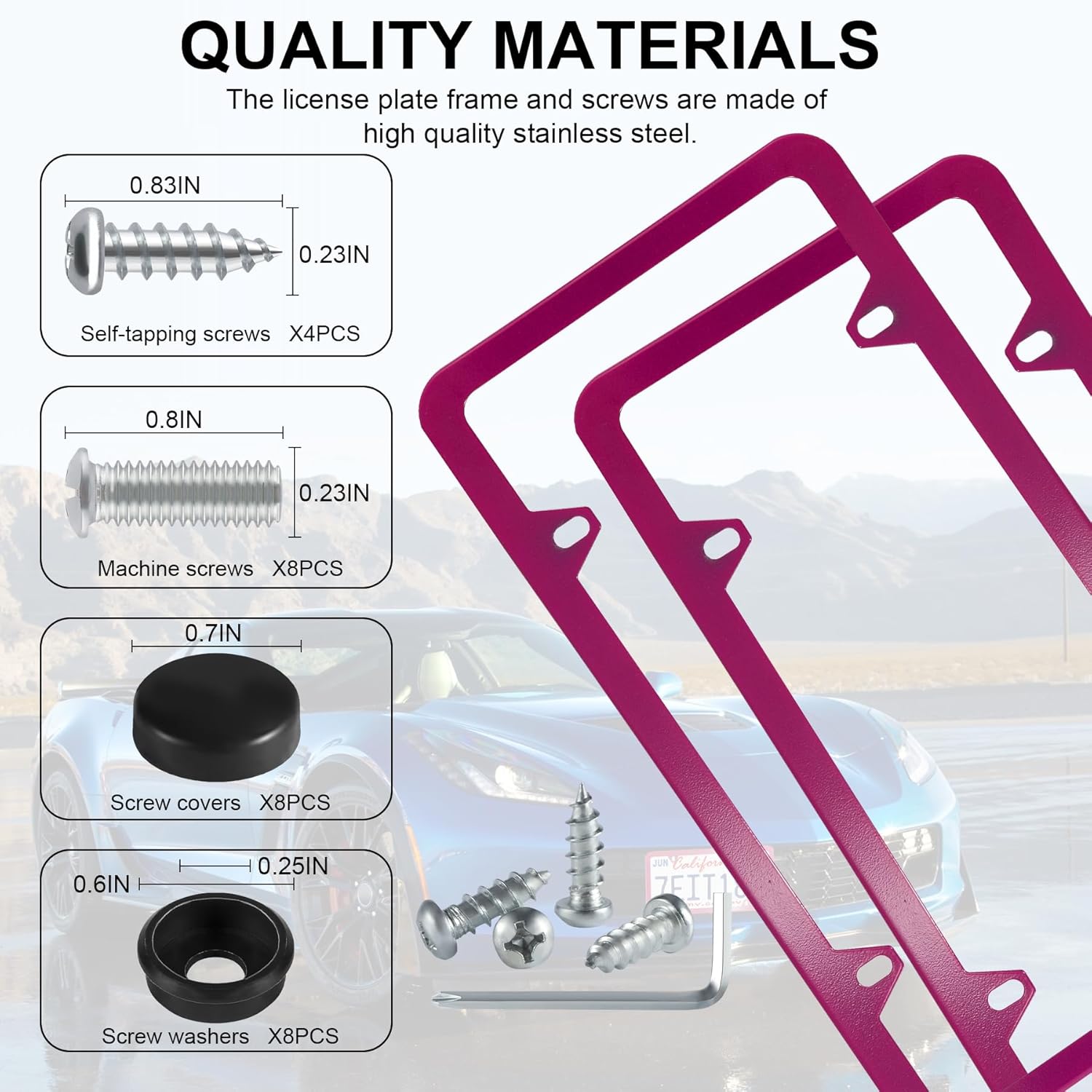 LivTee 4 Holes Stainless Steel License Plate Frames, 2 PCS Car Licence Plate Covers, Automotive Exterior Accessories Slim Design with Bolts Washer Caps for US Vehicles, Hot Pink