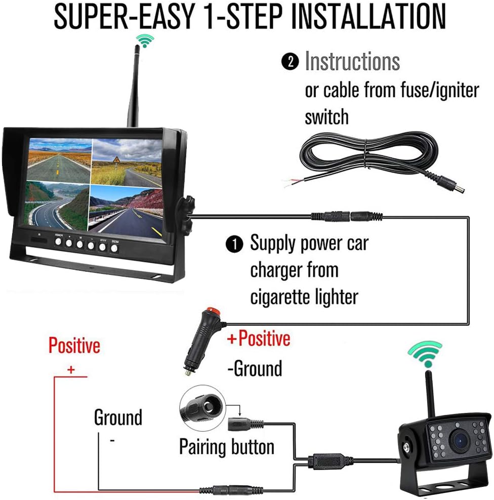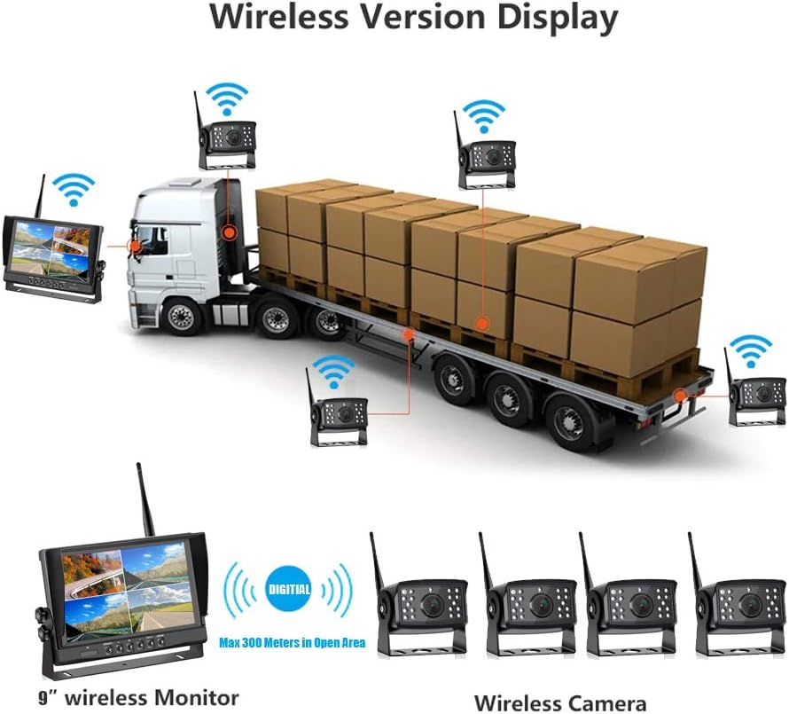 - 4PCS HD1080P CAR BACKUP CAMERAS: 18 Infrared Lights and HD 960P CMOS Sensor,Digital High definition Image Processor Will Present Superior Night Vision For You.Super IP69 Waterproof Standard.149° Wide View,Make Your Reversing More Confident and Safety, Please note you have to connect power for the cameras and the monitor.