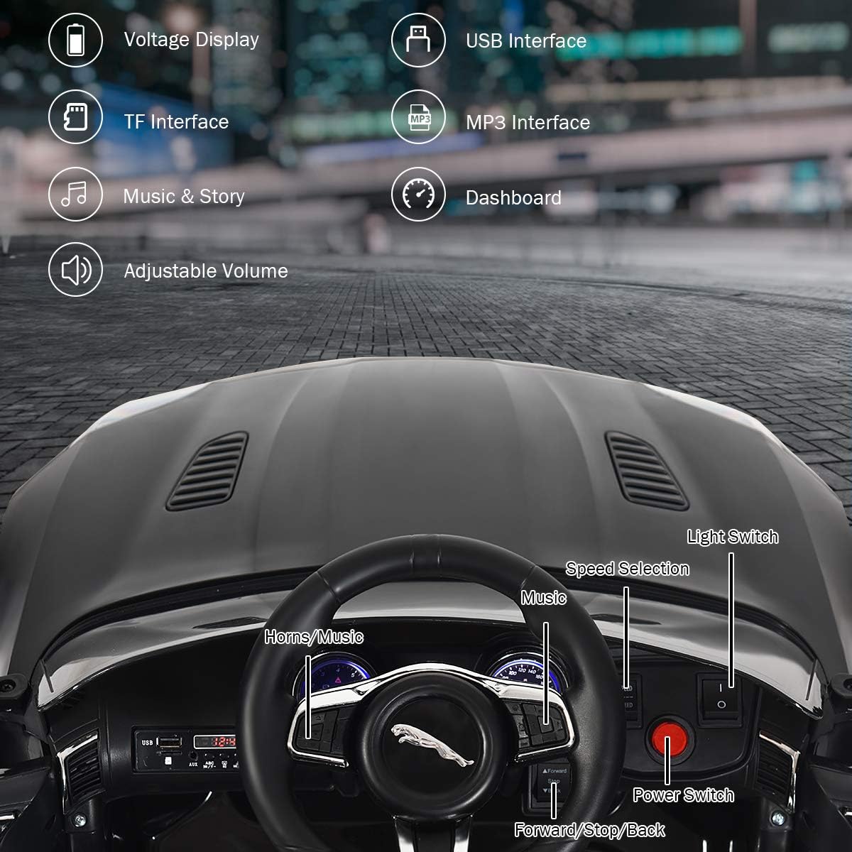 - 【Cool Licensed Ride On Car】This officially licensed Jaguar F-type toy car has a cool and stylish appearance along with headlights and horns. Featuring dual exhaust pipes and mirrors, this kids ride on car greatly imitates the real car. Besides, double-door opening design makes it easier for babies to get in and out smoothly.