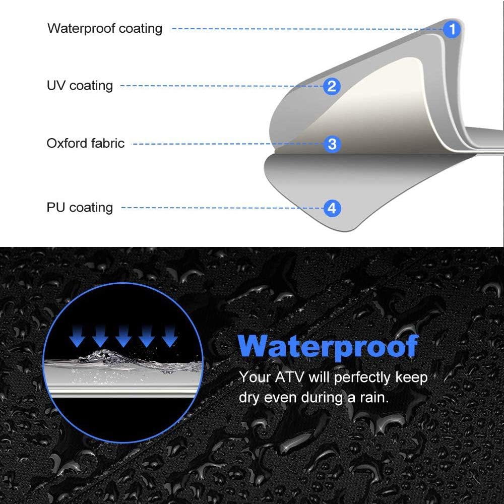 - DURABLE MATERIAL THAN OTHERSL----300D oxford cloth and our special textile process(Waterproof PU coating). which is more weather-resistant, tear-resistant, and wear-resistant. The entire 4 wheeler cover is made of precision two-thread stitching, absolutely enough firm at the seams. Its product life is 2 times and more than most other ATV Covers.