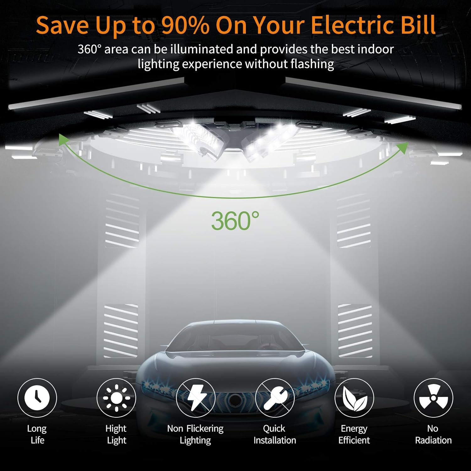 - đź’ˇEASY TO INSTALL&WIDE APPLICATIONđź’ˇ The Garage light fixture is very easy to Install, no tools required, no wiring, suit for E26/E27 base, just screw garage light bulb into a normal lamp receptacle. And this LED Garage light is good for large areas, garages, barns, storage rooms, warehouses, workshops and so on.