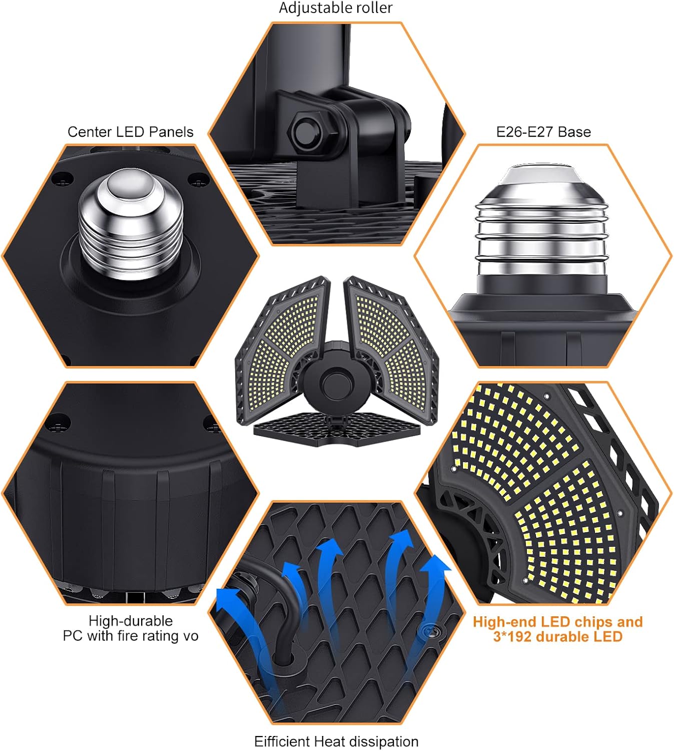 - đź’ˇBRIGHT LED GARAGE LIGHTSđź’ˇ This garage light equips 3 ultra-bright adjustable LED heads with 576 PCS LED chips, it provides total 18500 lumens, 6000K daylight source and CRI> 80Ra color rendering index, which helps you get clearer vision and reduce visual fatigue with the best indoor lighting environment.