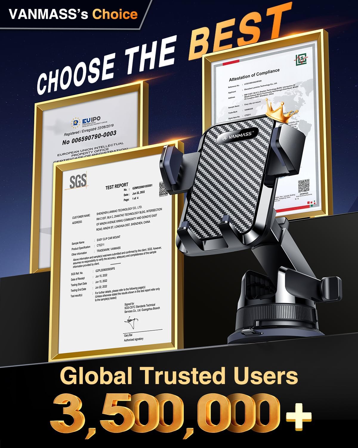 - 【BEST Newest Car Phone Holder】VANMASS's best car phone mount with the highest rating! Preferred by 3,500,000+ Customers; Designed by world-class professional team; enjoy EUIPO Patent (No.007708805-0001), Military-grade certificate (No. GZMR220601855501), CP65/REACH/ROHS; 4,000+ kinds of material selection, 500+ suction cup upgrade designs, and 20,000 miles of road tests; giving birth to the best combo of the Flagship&Classic hoolder with newest suction cup