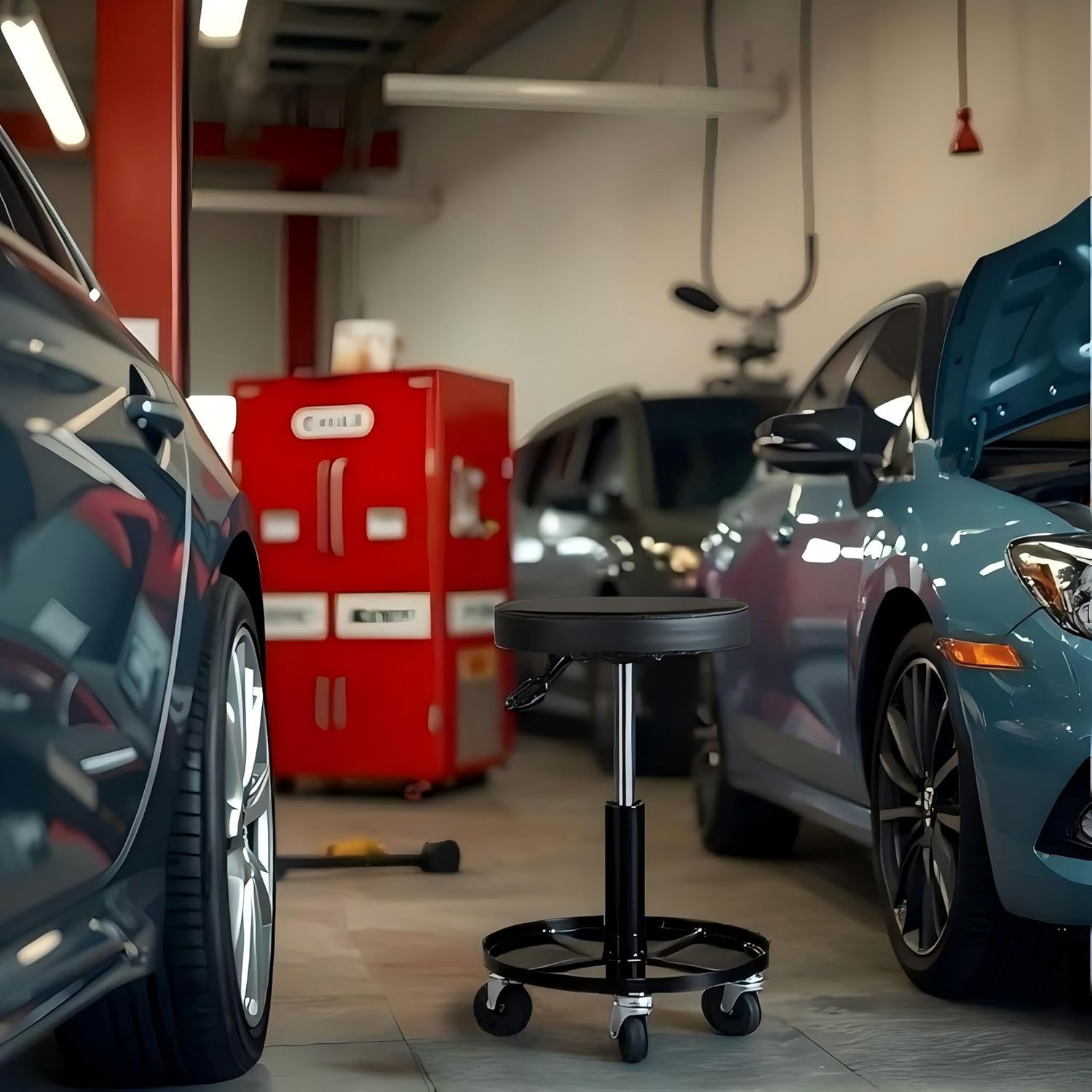 - This garage seat is very easy to assemble - completed in just a few minutes, you just take the three components out of the box (stand, gas cylinder, and seat), and press fit them together
