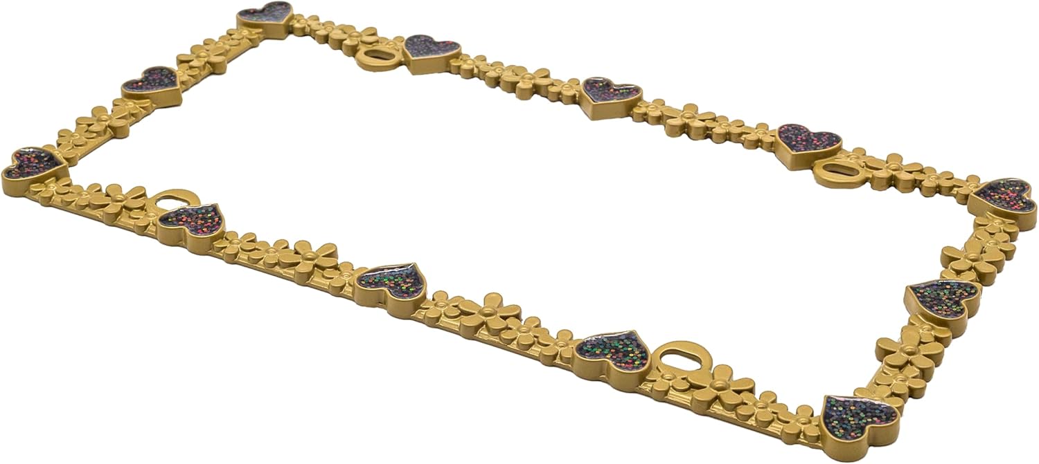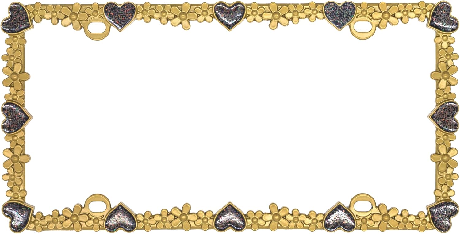 Creathome 3D Shining Daisy Heart License Plate Frame from Pure Zinc Alloy Metal Perfect Plate Holder, Matt Gold with Black Glitter, Luminously Heart