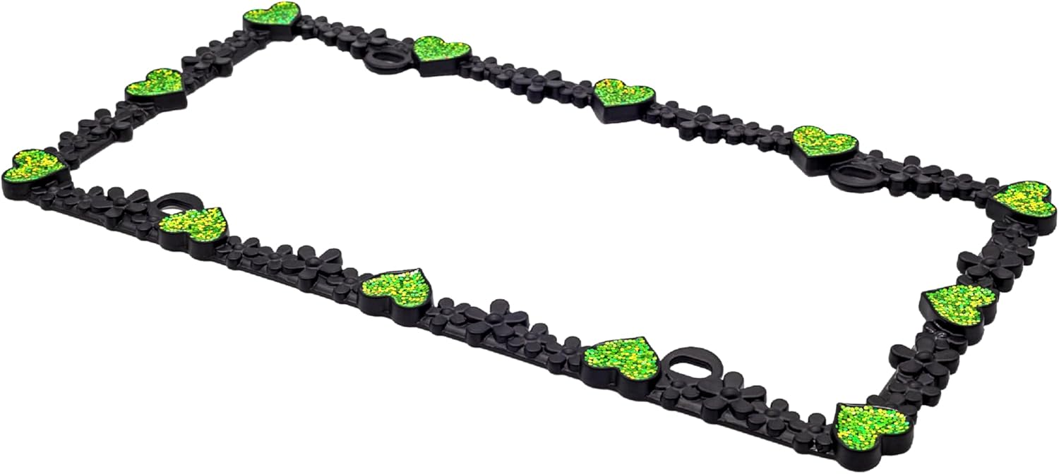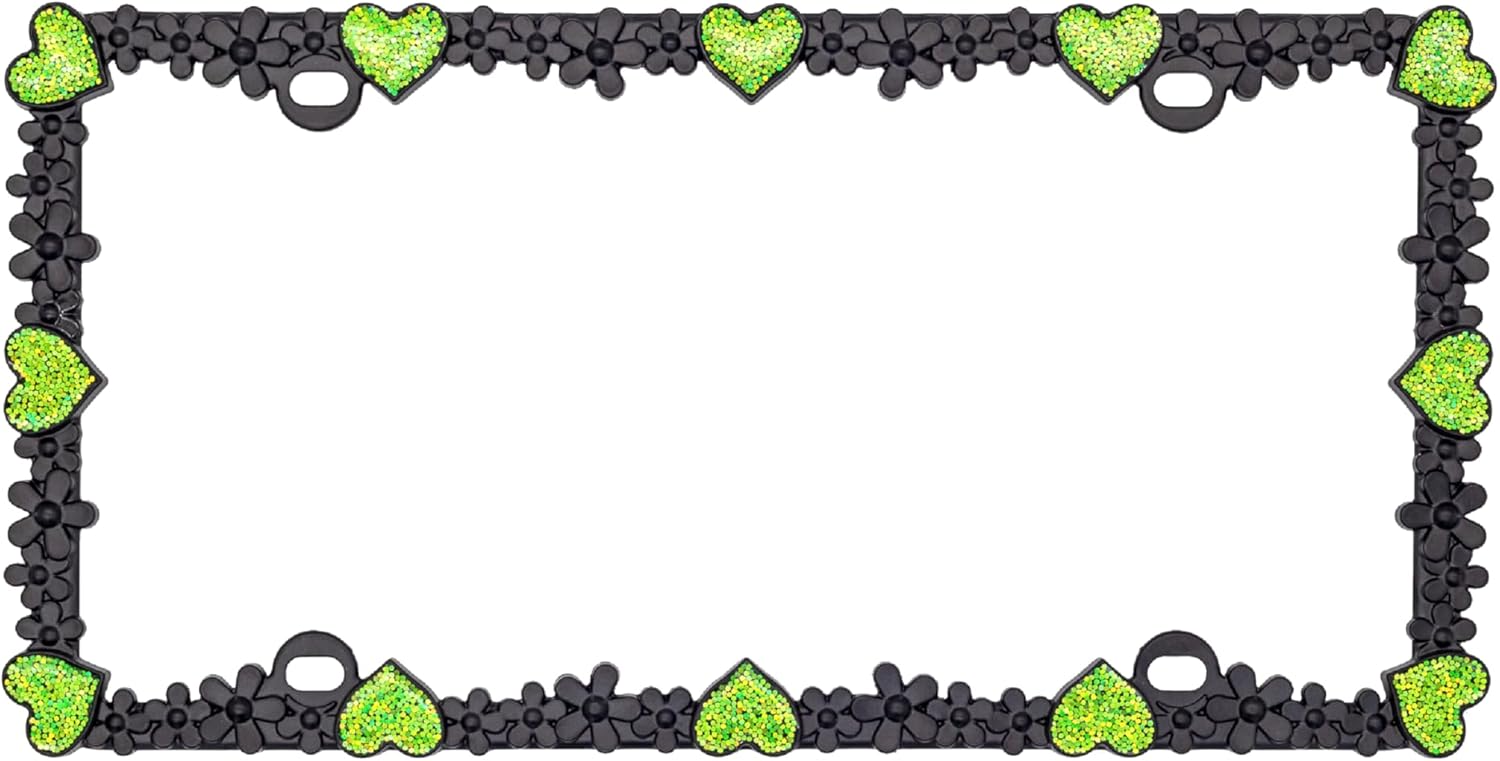 Creathome 3D Shining Daisy Heart License Plate Frame from Pure Zinc Alloy Metal Perfect Plate Holder, Matt Black with Green Glitter, Luminously Heart