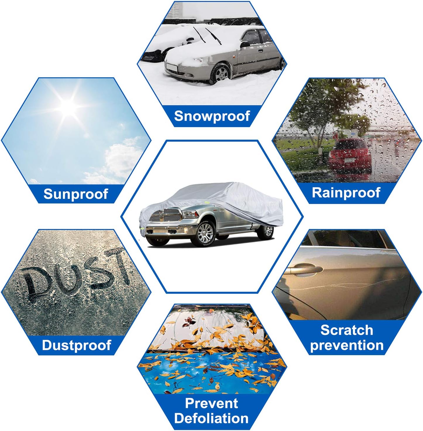 - 【upgrade material】--1. Using the latest KouKou multilayer heavy and safe material, full exterior covers has a very high resistance to impact and abrasion resistance, 100% waterproof. 2. Silver appearance has the advantages of good heat preservation and UV protection. Keep the car cool in the summer. 3. The lining material is very soft and the friction coefficient is very low to protect your car paint. koukou multi-layer material is much thicker and more durable than other similar products.
