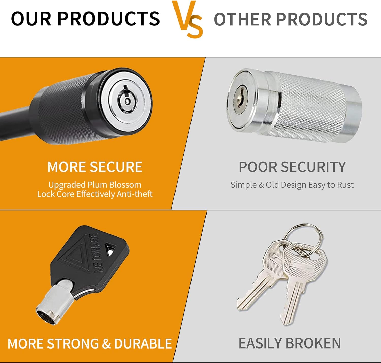 - 【PUSH-TO-LOCK DESIGN】- Long trailer hitch lock is designed for easy operation. 1/4 turn lock and push lock design, you can easily push to lock it without using key. Built-in pop-up design makes operation effortless.