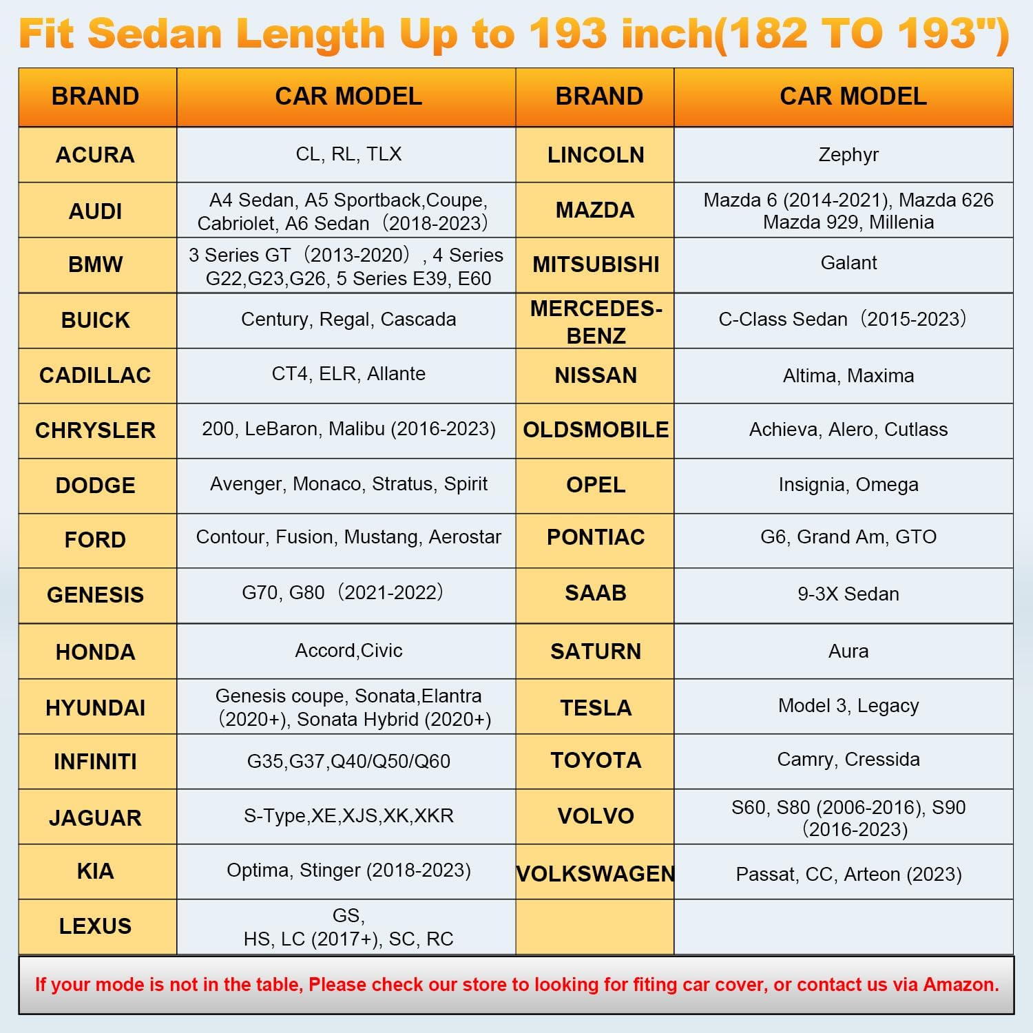 - Universal Fit for Sedan: Car cover SIZE: 490x182x150 cm/193''x72''x59'' inch, fit most sedan. Please Measure Your Car's Length First. Elastic pendulum and buckle can be adjusted freely. Come With A Large Enough Portable Storage Bag To Keep Your covertor para carro contra agua