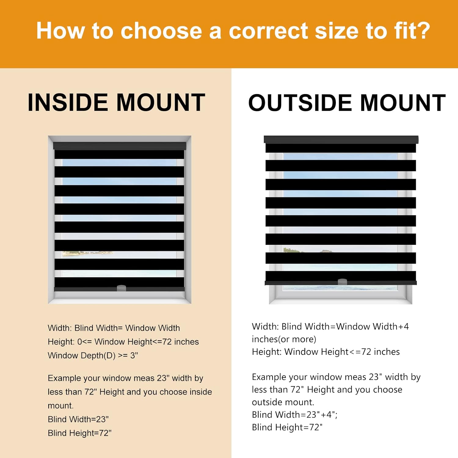 - 【How to choose a correct size to fit? Example your window meas 23" width x less than 72" Height.】INSIDE MOUNT: Window Width is Blind width. Blind Width=23"; Blind Height=72". OUTSIDE MOUNT: Plus at least 4" is blind width, Blind Width=23"+4"=27"; Blind Height=72".【Pls Note】Fabric width will be 0.8" narrower than the size of the blind.