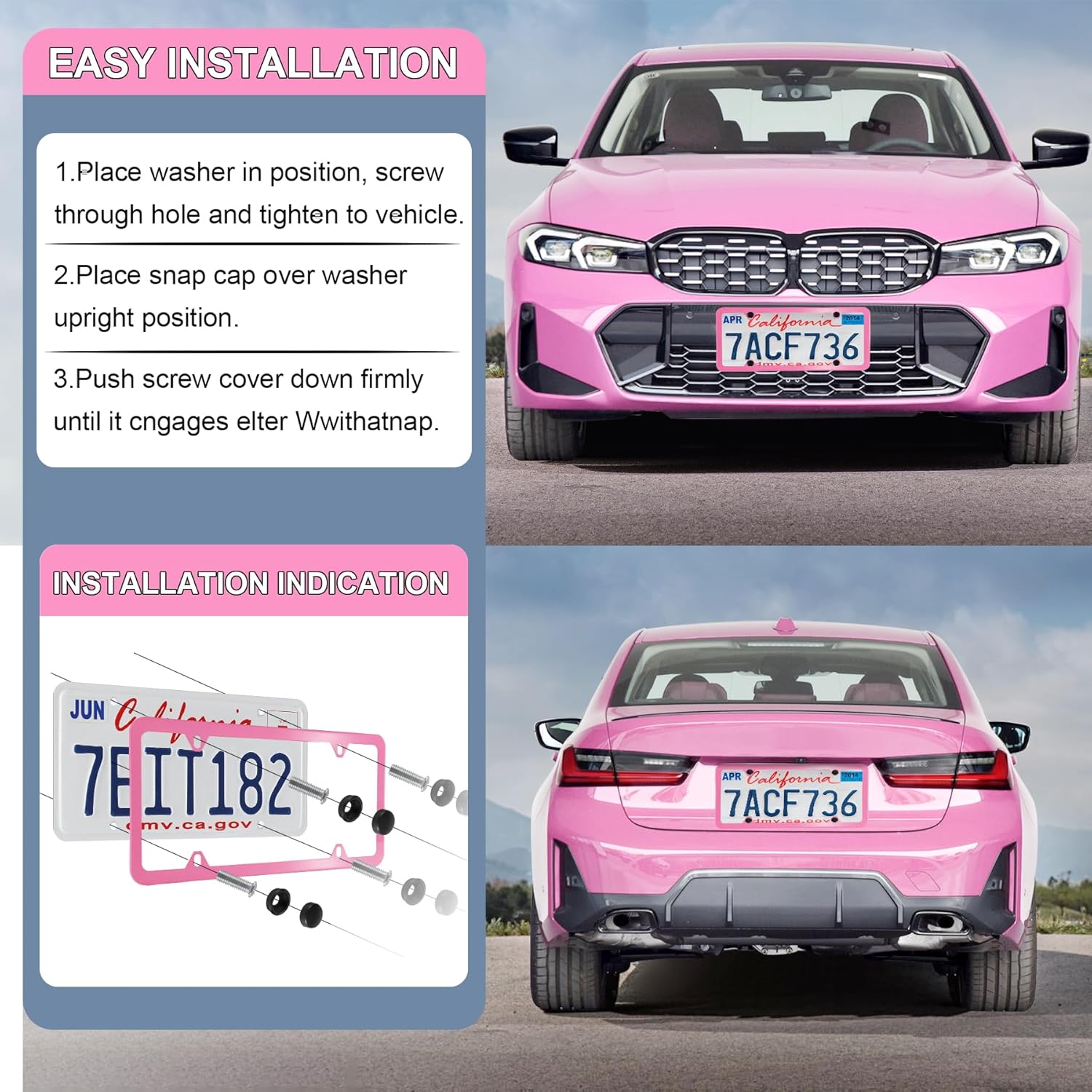 LivTee 4 Holes Stainless Steel License Plate Frames, 2 PCS Car Licence Plate Covers, Automotive Exterior Accessories Slim Design with Bolts Washer Caps for US Vehicles, Pink
