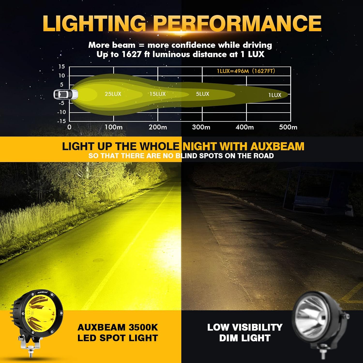 - 【Luminous Intensity】Single hole extra size reflective cup with model-7070 LED amber chips and latest developed optical lens, which luminous flux & valid irradiation distance 300% increasing, create SPOT BEAM pattern and make the round led offroad lights perform extremely bright lighting even in the daytime.