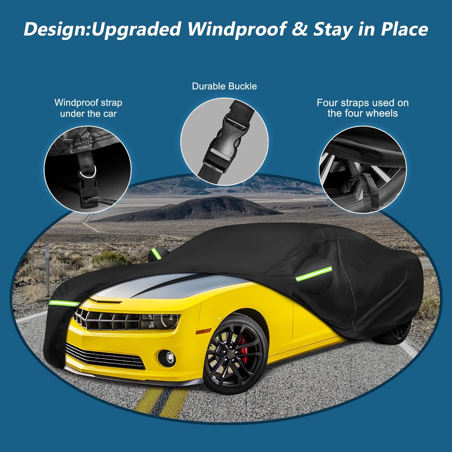 - 【Designs of Camaro car cover】(1) Black Coating: UV protection and heat-proof,prevent cracking and aging of inner decoration leather and plastic. (2)5 Reflective Strips attached on the front DRL lamps, middle Turning lights and Rear taillight to prevent collisions during the night.(3)It comes with four straps,a windproof buckle, a security lock and a storage bag.(4)Mirror Pocket: protect rear view mirror in all directions.