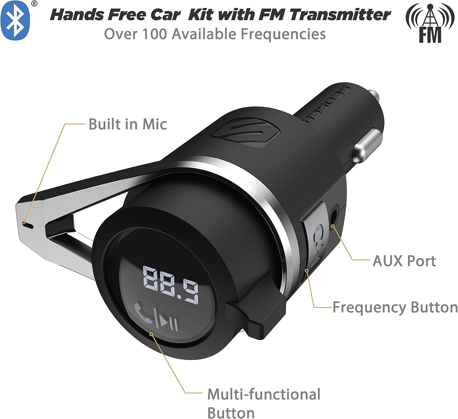 - Voice Command: Answer phone calls or play/pause your music with a simple press of a button on our Scosche FM Bluetooth Transmitter for car radio. With hands-free controls and built-in microphone that support Siri and Google Voice commands, make your in car audio experience safer and more convenient