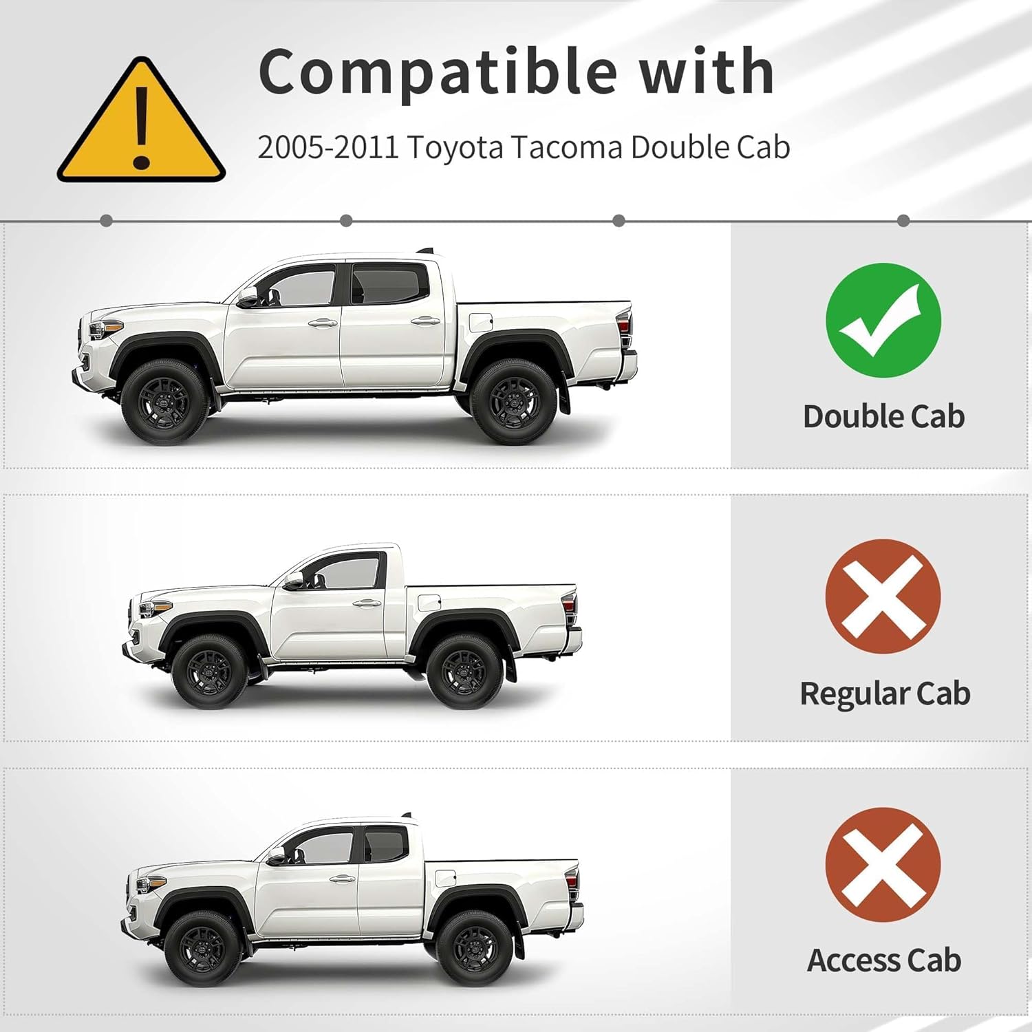 - Custom Fit: OEDRO Floor mats fit Toyota Tacoma Double Cab 2011 2010 2009 2008 2007 2006 2005; Comprehensive coverage is ensured by 3D laser scanning to protect the front and back of your Tacoma's footwell