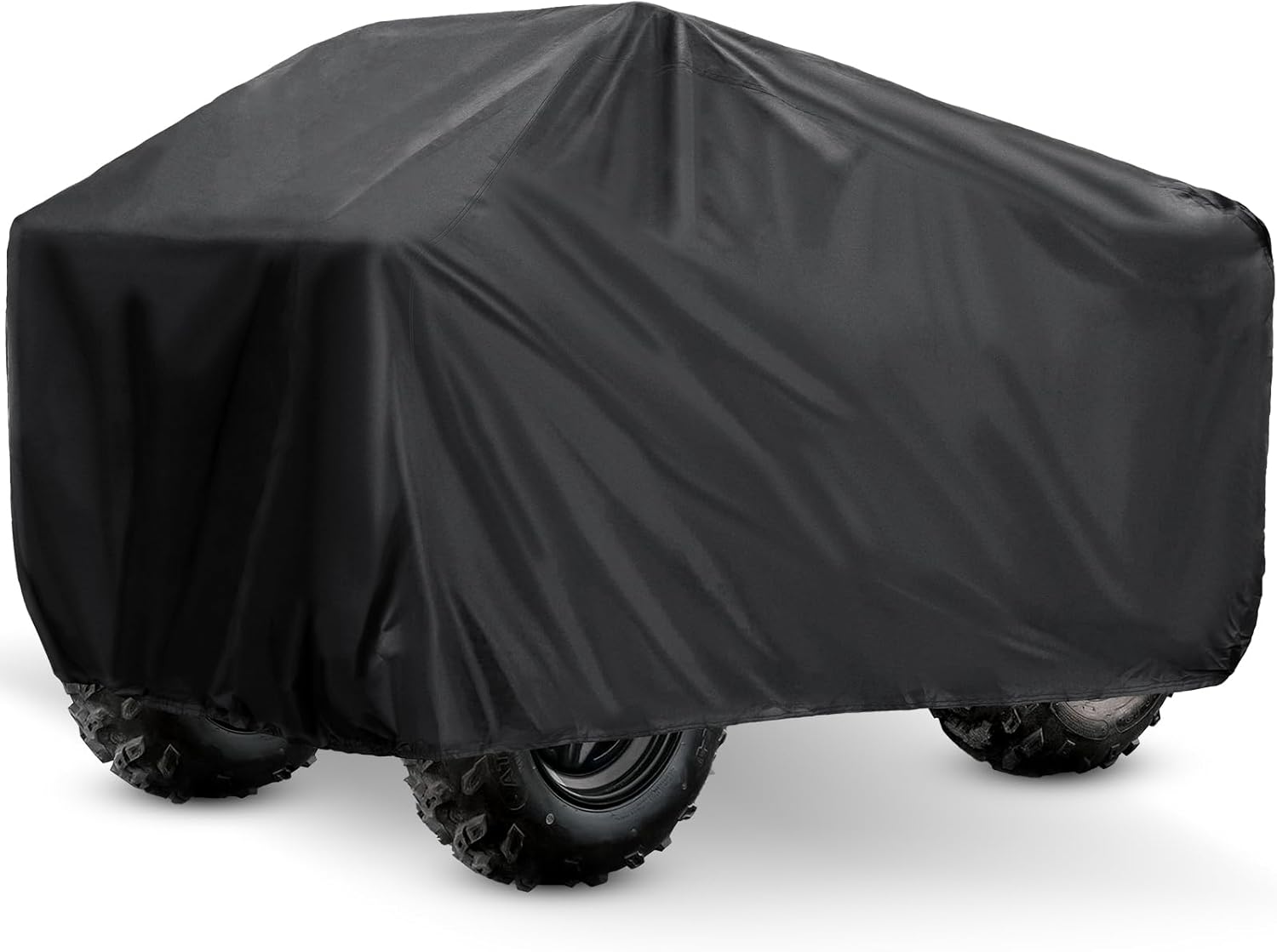 - Large 103 x 43 x 47 inch surface area fits easily over most models of small to extra large ATVs; elastic base wraps around tires with minimal effort and stays on while trailing on the freeway.