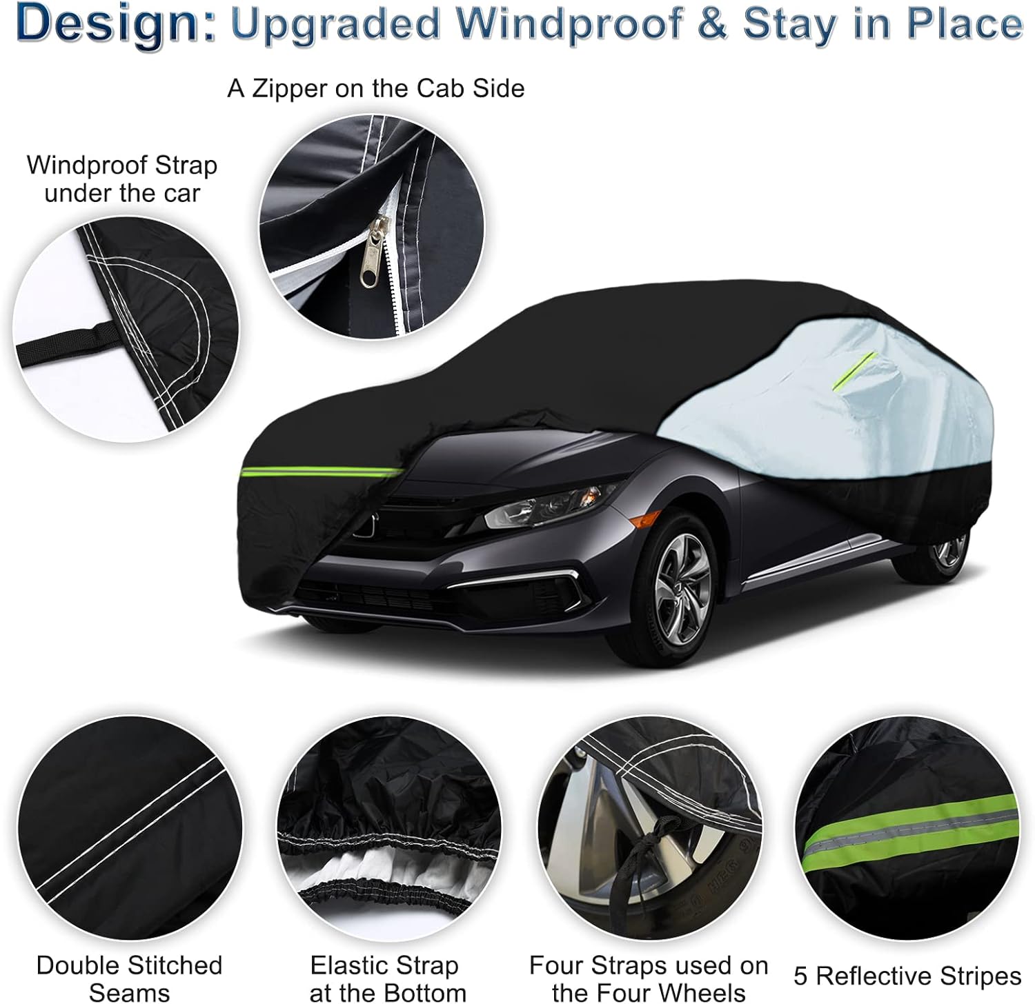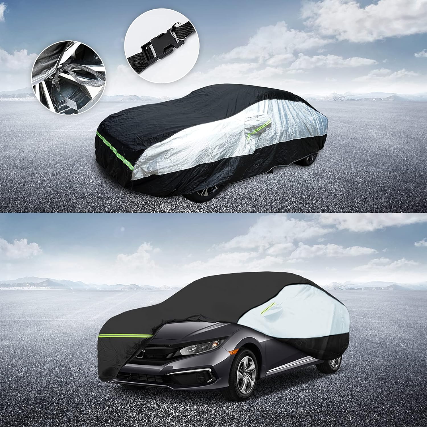 - 【Universal Vehicle Fit】Universal Car Cover fits Toyota Corolla/Honda Civic/Sentra/Ford Focus/Chevy Cruze/BWM 330/Audi A4. Size: 193''(L) x 70.8''(W) x 59''(H). Confirm your car model and dimensions before ordering. Note: Ensure dry car body before use.