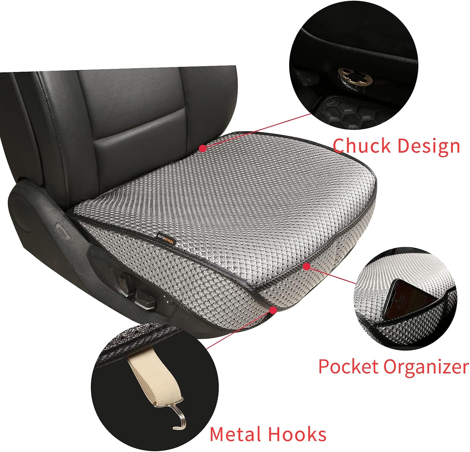 - 5. 【Easy to install】 2 minutes after watching the video. The installation only needs 2 steps, just hang 2 metal hooks under the seat and clamp the 2 chucks on the seat back.