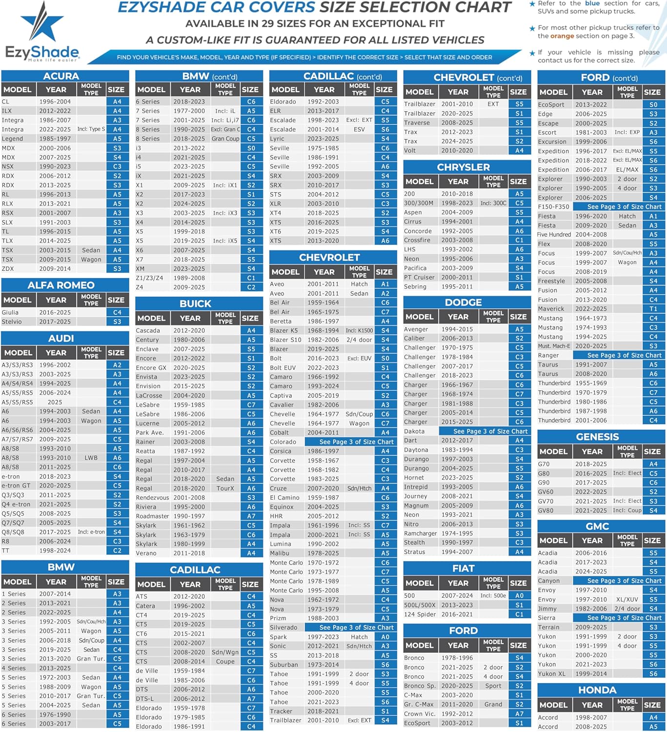 - BEST FIT, BEST PROTECTION. Find your vehicle in the SIZE CHART. Don't persist with car covers that don't quite fit right. EzyShade Car Covers are extensively tested to achieve a custom-like fit for every vehicle in the size chart, GUARANTEED! (see the Size Chart in images 4 to 6)