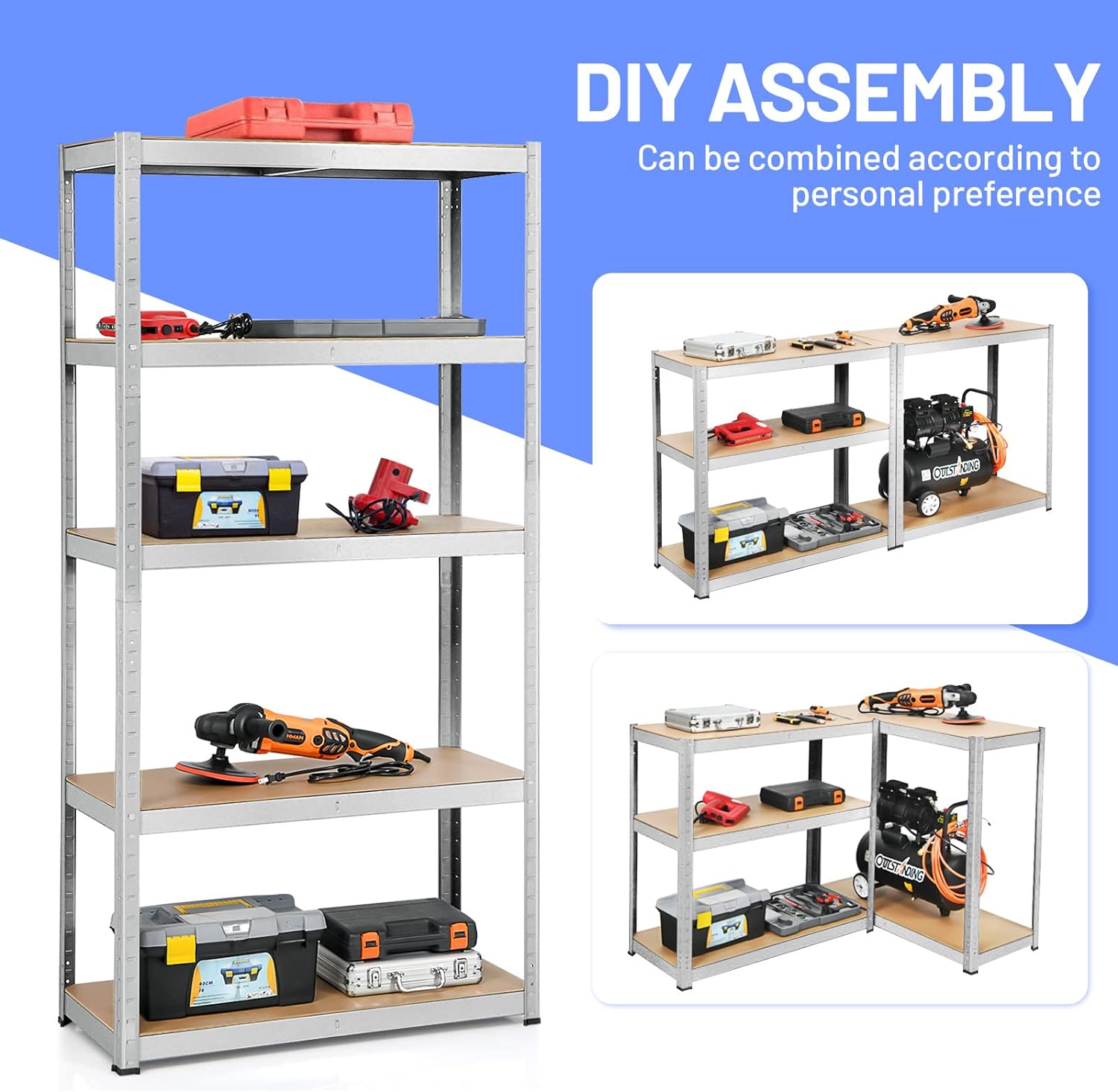 - HEAVY-DUTY 385 LB PER SHELF – Industrial-grade steel frame and reinforced MDF boards support up to 385 lbs per tier (1,925 lbs total). Perfect for tools, bins, appliances, or workshop gear.