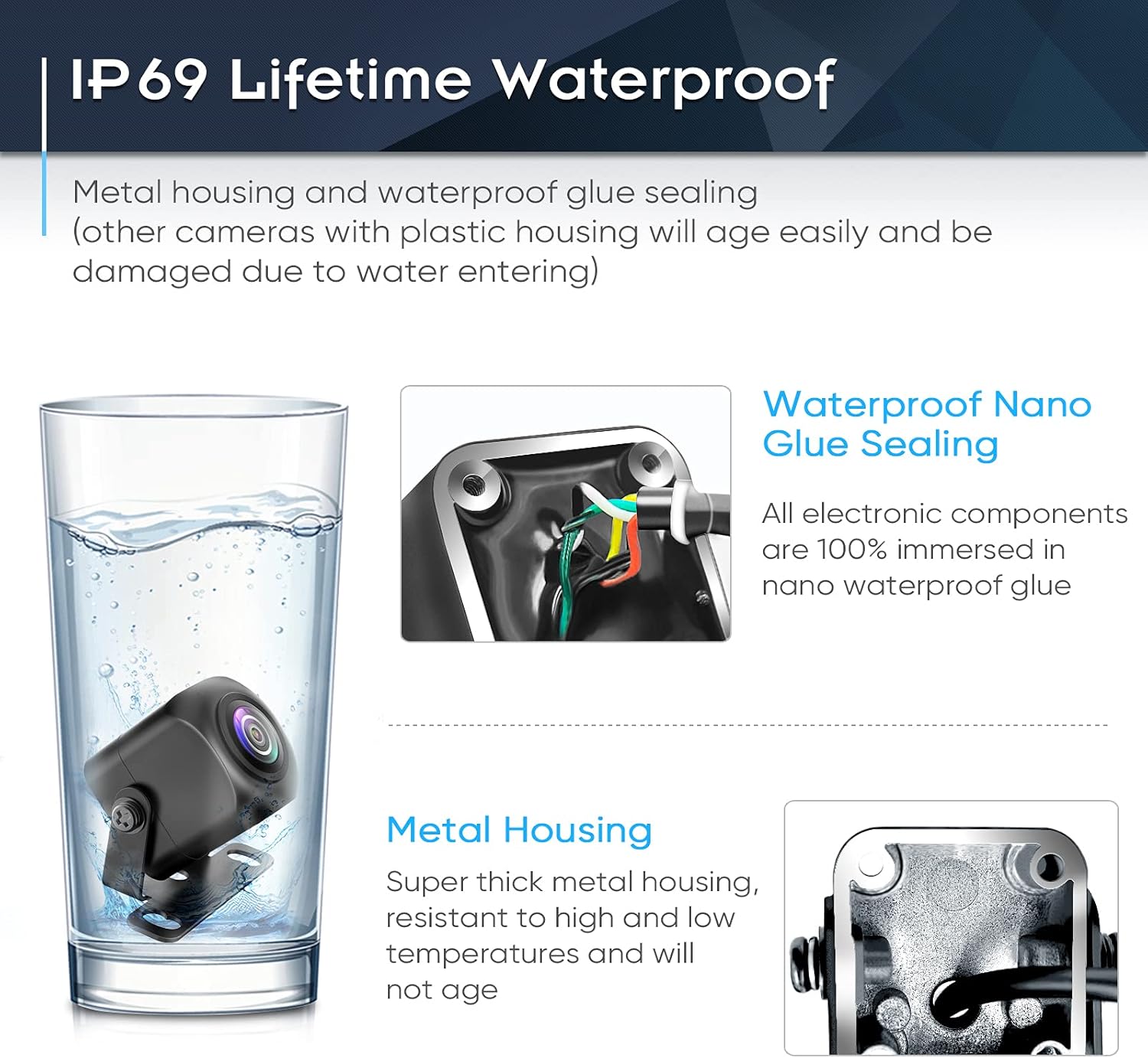 - 【Sturdy Alloy Housing】First put the lens and PCB in the alloy housing, then fill and seal with Nano waterproof glue, in any weather, high or low temperature, PMD2A-S reverse camera is waterproof for lifetime. In the unlikely event of water coming in, we will provide a brand new backup cam for you.