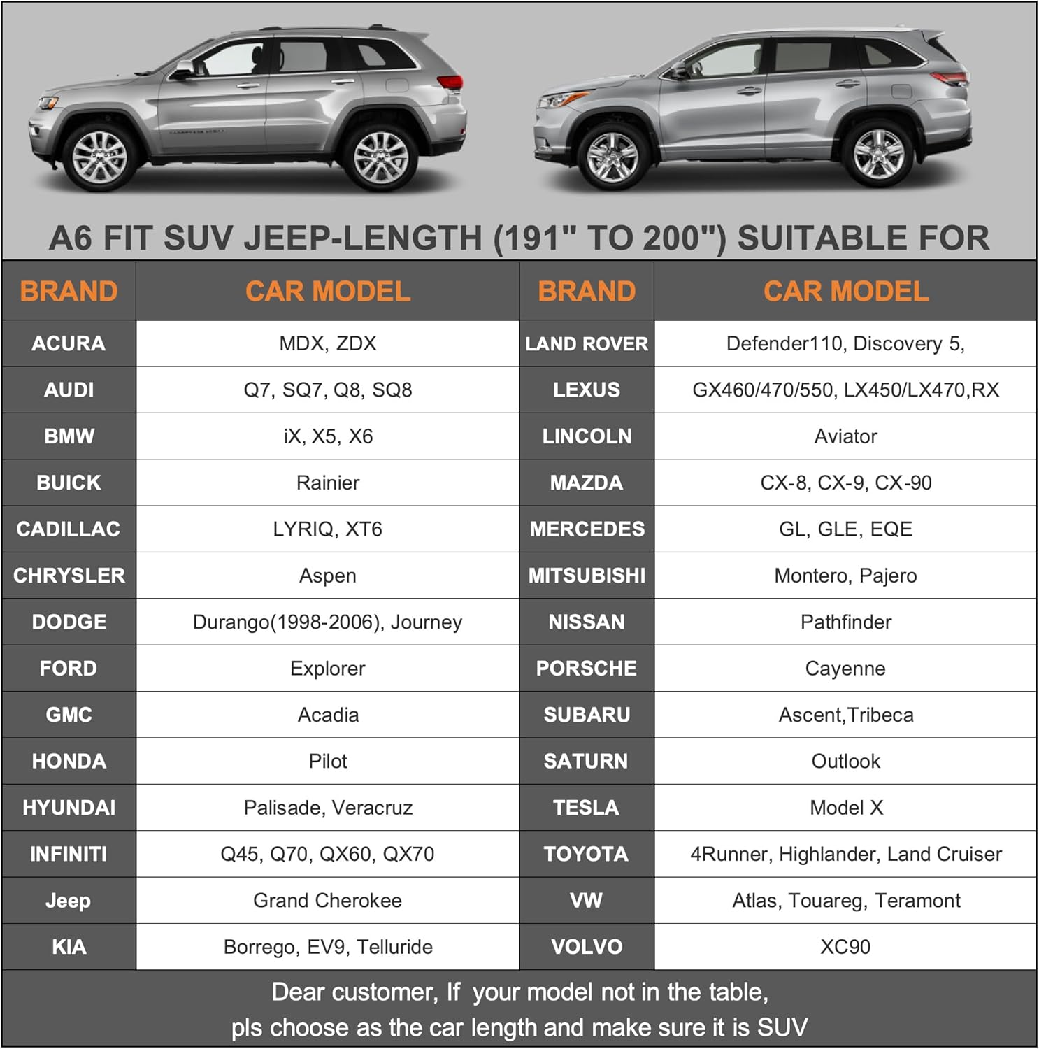 - 【Dimension A6】Universal fit for Suv which length is 191-201 inch (Not for hatchback and sedan). Suitable for Ford Explorer, Toyota Highlander/Land Cruiser, Honda pilot, Acura MDX/ZDX, Cadillac XT6, Lexus RX/LX, Infiniti FX/QX60/70, Kia Telluride, Hyundai Palisade/Veracruz, Nissan Pathfinder, Porsche Cayenne, Audi Q7/Q8, BMW X5/X6, Volkswagen Atlas/Touareg, Tesla Model X etc.