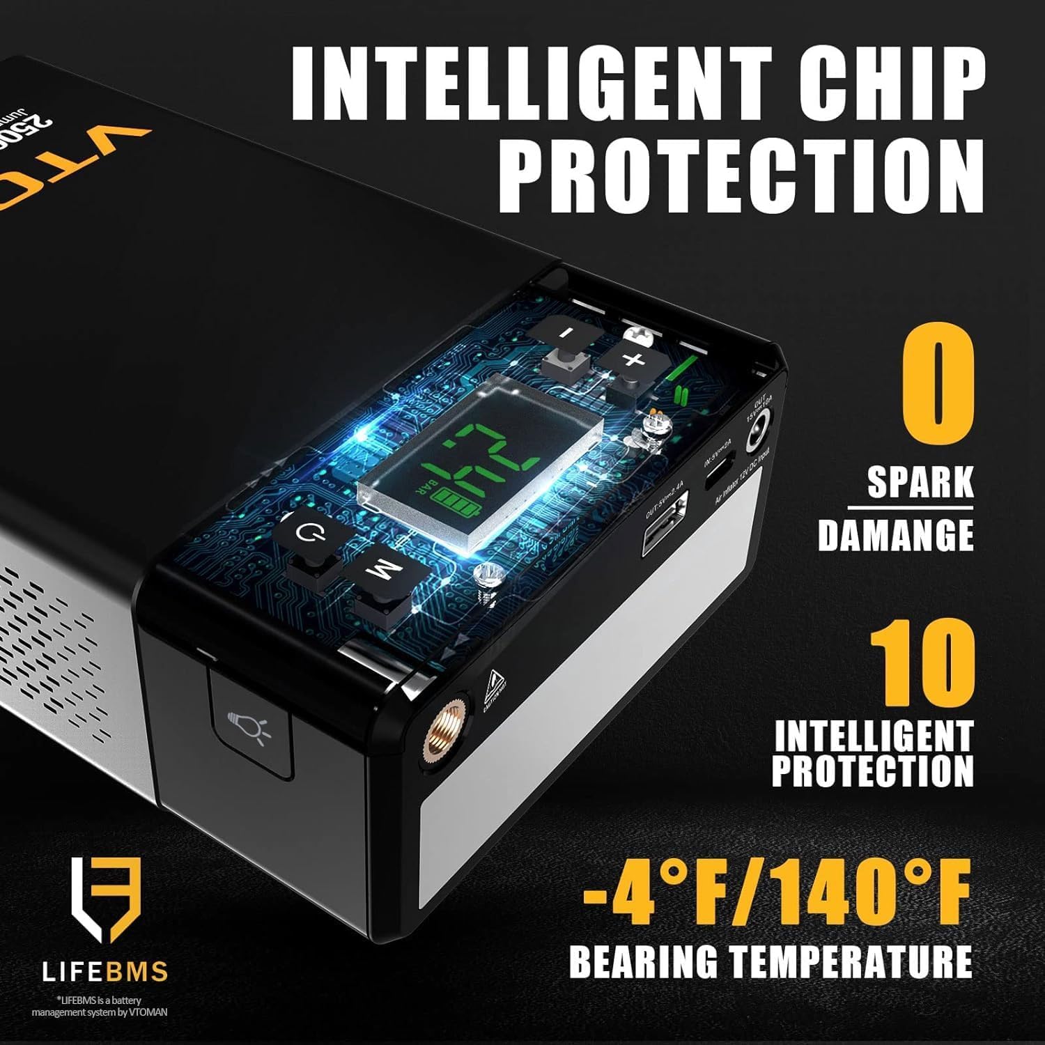 - 【Ultimate Safety Redefined】The unique design of the X1 car battery booster makes it easy and fast to start your car in extreme environments (-4°F to 140°F), with built-in 10 safety protection technologies (over-charge, over-current, short-circuit, reverse-polarity, low-temp, high-temp, over-voltage, over-load, spark-proof, reverse-charge). VTOMAN jump starter with air compressor provides you with safety Ultimate protection, delivering peace of mind through every ignition cycle.