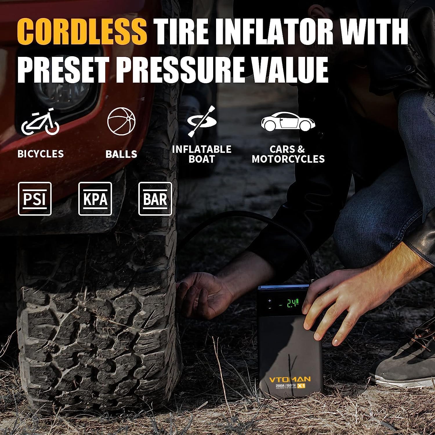 - 【Digital Cordless Air Compressor】 The VTOMAN X1 jump box for car battery with air compressor has a built-in LCD digital meter. Most importantly, the X1 is equipped with a tire pressure detection function. You can preset the value( PSI, BAR, KPA) you want and it will automatically shut off when the pressure is reached. The 150 PSI air compressor takes about 2 minutes to inflate an average passenger car tire to 20 PSI and is suitable for bikes, passenger cars, balls, and other inflatables. Tire inflation time for different automotive fit type models: MODEL3 - 4MIN30S, MODELY - 4MIN35S, Jeep off-road - 6MIN7S.
