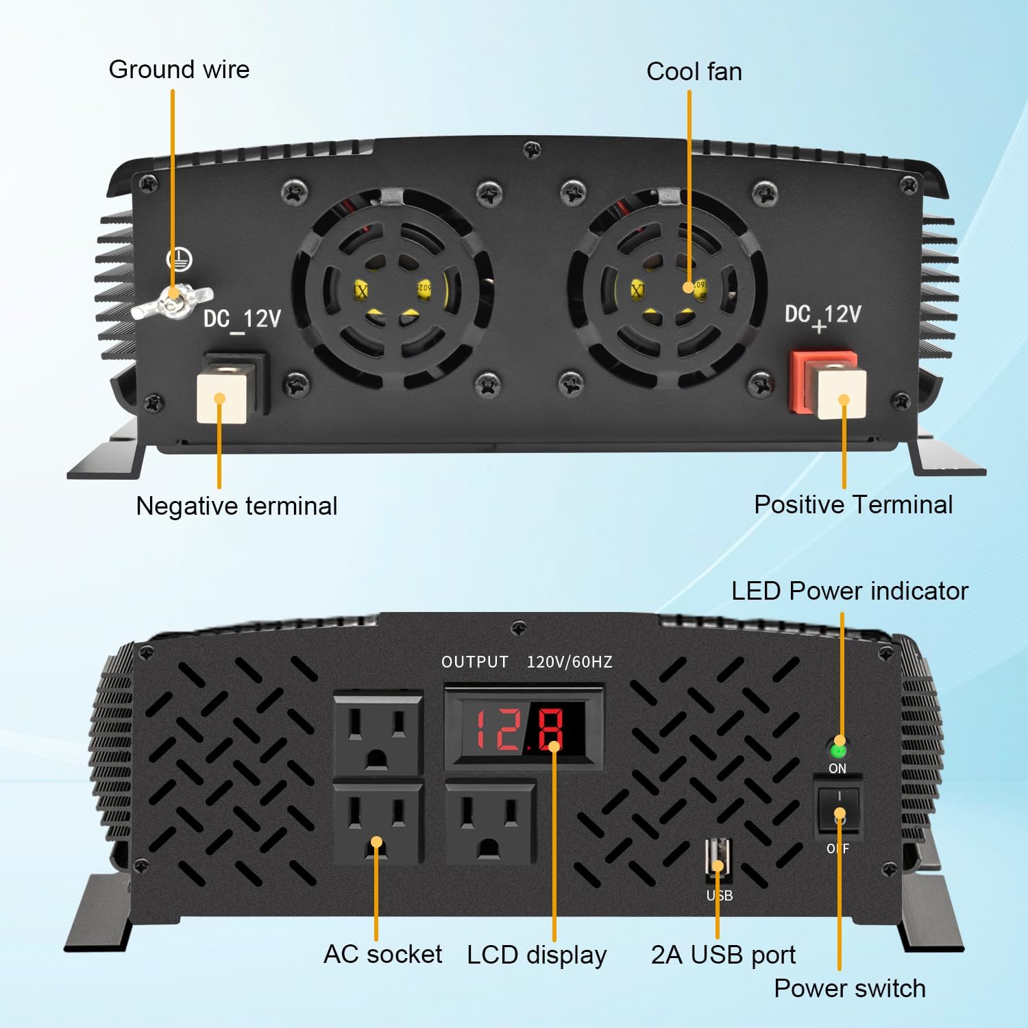- 4.【Silent t& powerful cooling fan】: Being equipped with 3 powerful fans ,The 12 volt car inverter can realize fast heat dissipation. Its smart cooling fan system only works when the device gets warmer or output power exceeds, slows down and stops working when the temperature gets down. making the truck inverter work silently most of time.