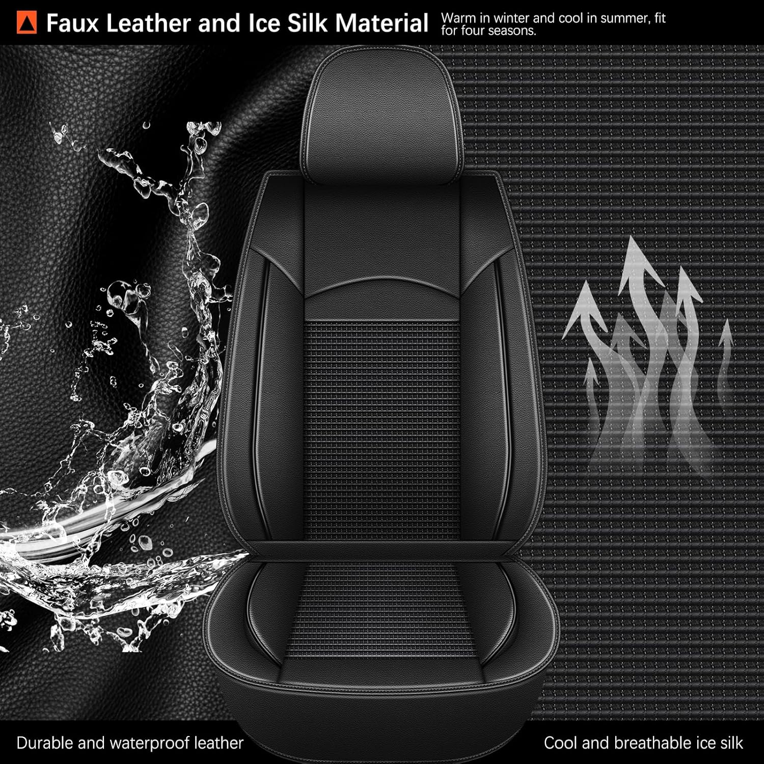 - 🔥🚗【HIGH QUALITY MATERIAL】: The car seat covers protector full set is made of high-quality faux leather and ice silk, with the breathable and waterproof design, ensuring that your car seat is sweat-absorbent, breathable, and comfortable to the touch, providing a cozy riding experience for you and your family. The unique ice silk weave of automotive seat cover allows you to keep your driving more refreshing in the hot summer, warm in winter.