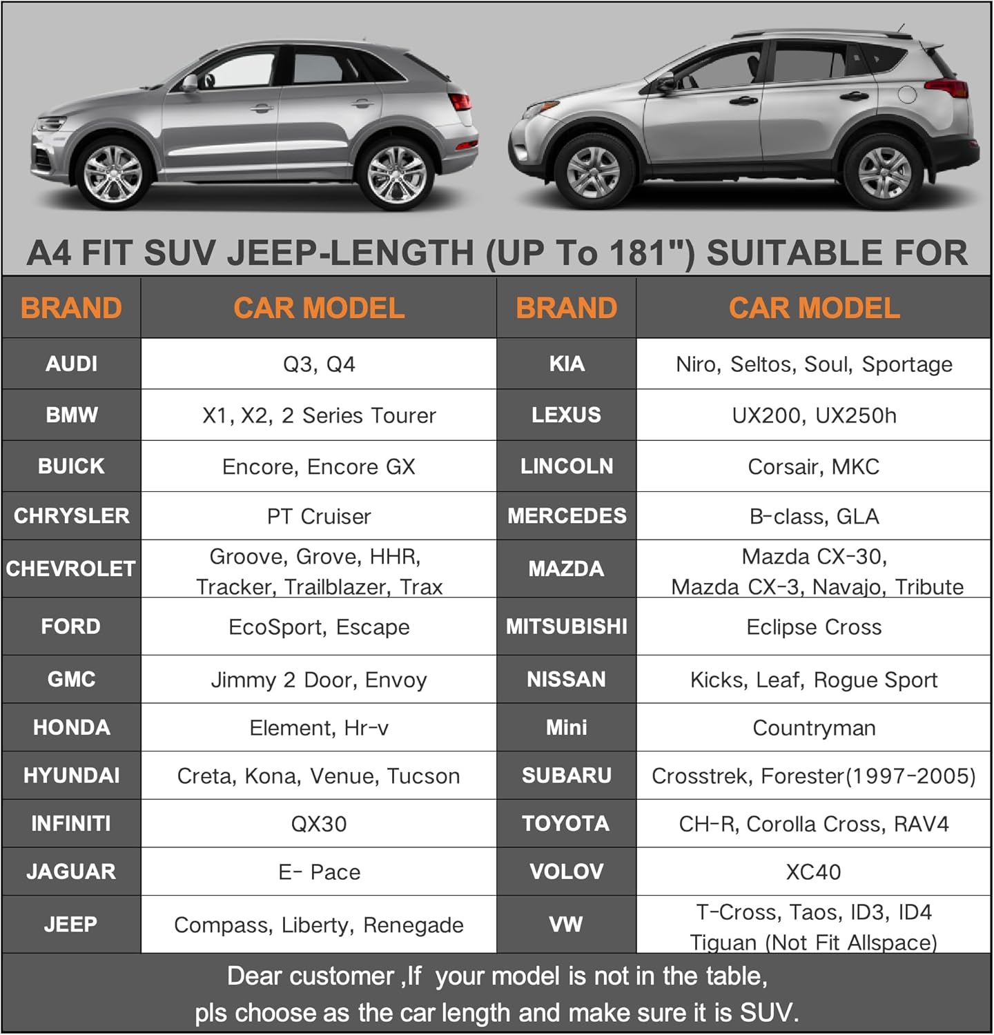 - 【Dimension A4】— Universal fit for Suv Jeep which length is up to 181 inch (NOT FOR SEDAN AND HATCHBACK). Suitable for Audi q3, BMW X1, Honda hrv, Hyundai Tucson/Kona, Volvo XC40, Buick Encore, Jeep compass/liberty/renegade, Kia Soul/Sportage, Subaru forester/xv etc.