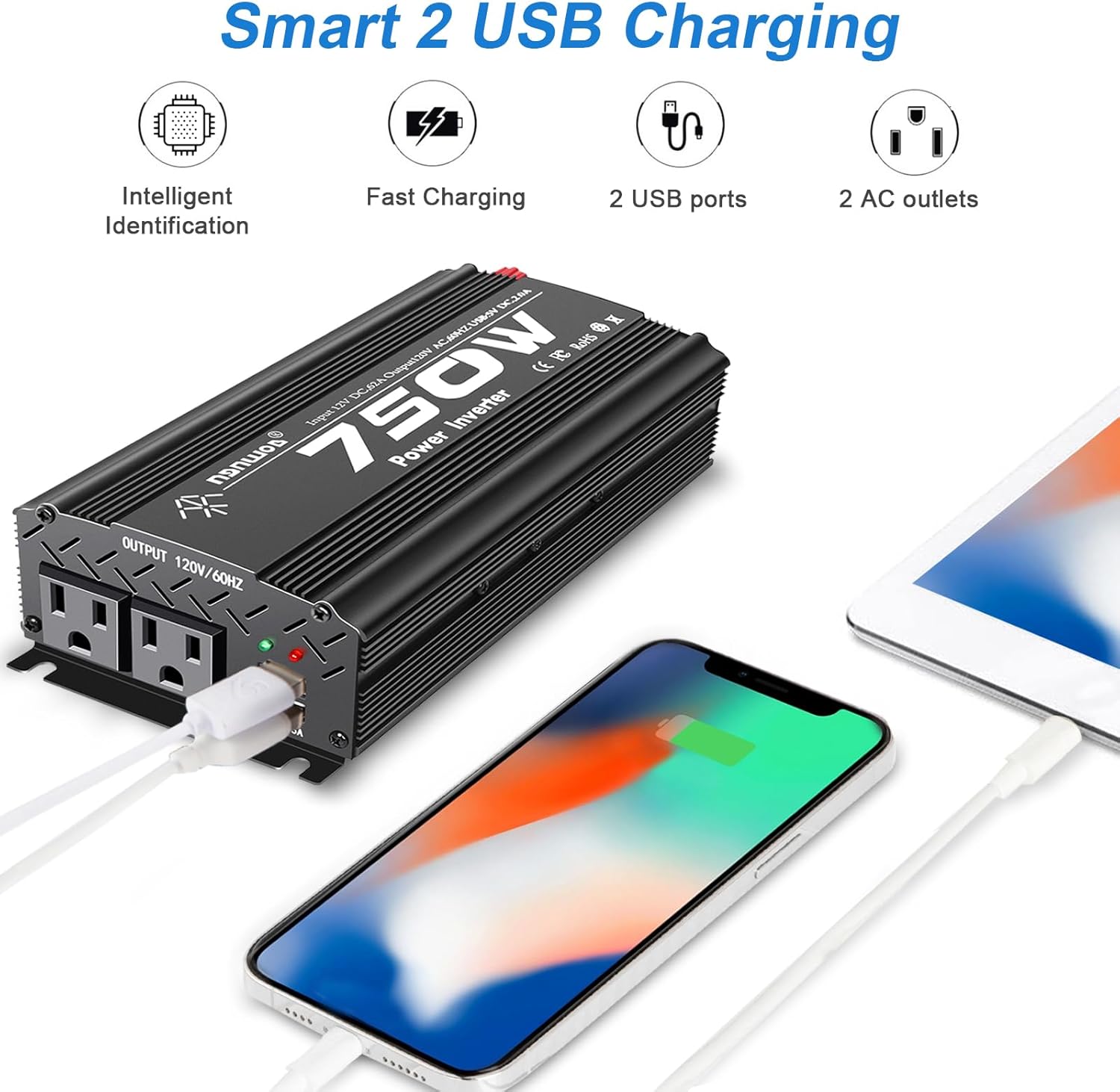 - 2.【Safe & Fast charging technology】: Safe charging technology of the 12V inverter provides protection against overheating, under and over voltage charging, short circuiting, overloads, and overcharging; Fast charging technology enable its dual USB outlets to detect and provide corresponding optimal charging speed to your different devices.